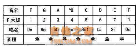 F大调F大调就是将调式音阶的主音1(do)音成F音那样高,1音确定的同时,按照自然大调音阶“全全半全全全半”的音程关系,F大调的音阶就可以在指板上找出来了: