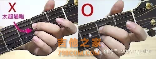 如果靠在琴衍上或太超过琴衍都不行,吉他会容易发出「闷闷」的声音,这样吉他的声音就不干净了。例如:A7