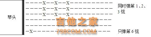 分解和弦伴奏记谱:在六线上画“X”,此时六线谱上方往往有关于左手按和弦的指法图 或标记表示。那么你就用左手按好和弦,“X”表示用右手指弹响其所在的弦。