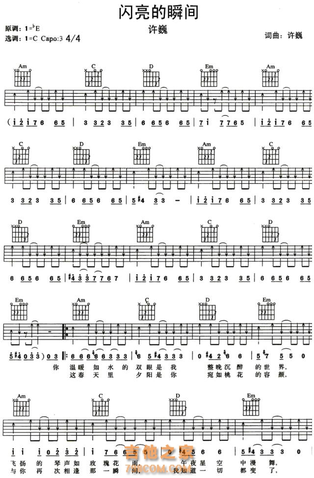 本章为“许巍《闪亮的瞬间》闪亮的瞬间吉他谱 ”信息,了解更多高清无码版本吉他谱、尤克里里、教学视频等信息,请关注吉他之家,我们会持续更新。