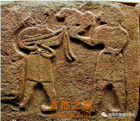 2.起源说法二:由古希腊的西赛拉琴(Sithurs)演变而来。(目前资料缺少无图) 3.起源说法三:有根据的古典吉他远祖,赫梯吉他(Hittite Guitar);考古学家在1400年前生活在小亚细亚和叙利亚北部的古赫梯人城门遗址上发现的“赫梯吉他”,这是找到的最古老类似现代吉他(一样具有弯曲的琴体)的乐器。它长下面这样: