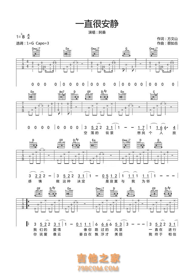 本章为“阿桑《一直很安静》一直很安静吉他谱 ”信息,了解更多高清无码版本吉他谱、尤克里里、教学视频等信息,请关注吉他之家,我们会持续更新。