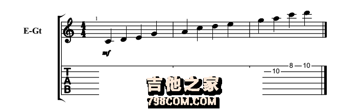 今天我给大家介绍一个五声音阶的练习方法。 五声音阶听上去是非常简单的一个音阶,但是你需要非常熟悉五声音阶,并且在各个把位都很熟悉它并不简单。 想要在任一调里,任一把位自由的弹奏,你需要对这五个把位做相关的练习,才能做到这点。 那该怎么进行练习呢?接下来我给大家介绍几个实用的方法。 01 五个把位的五声音阶练习 要熟悉五声音阶的各个把位,当然首先要知道每个把位具体的弹法。依次过一遍五个把位。以C大调为例,五声音阶的第一把位如下。