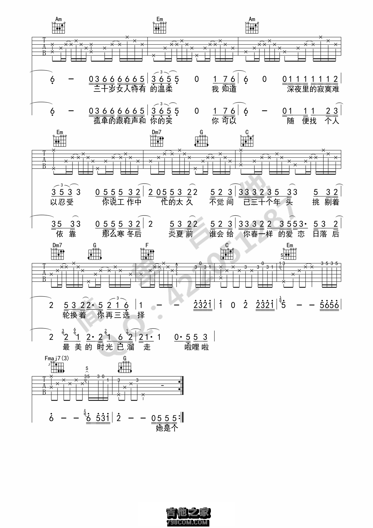 本章为“三十岁的女人吉他谱—赵雷(C调简单版) ”信息,了解更多高清无码版本吉他谱、尤克里里、教学视频等信息,请关注吉他之家,我们会持续更新。