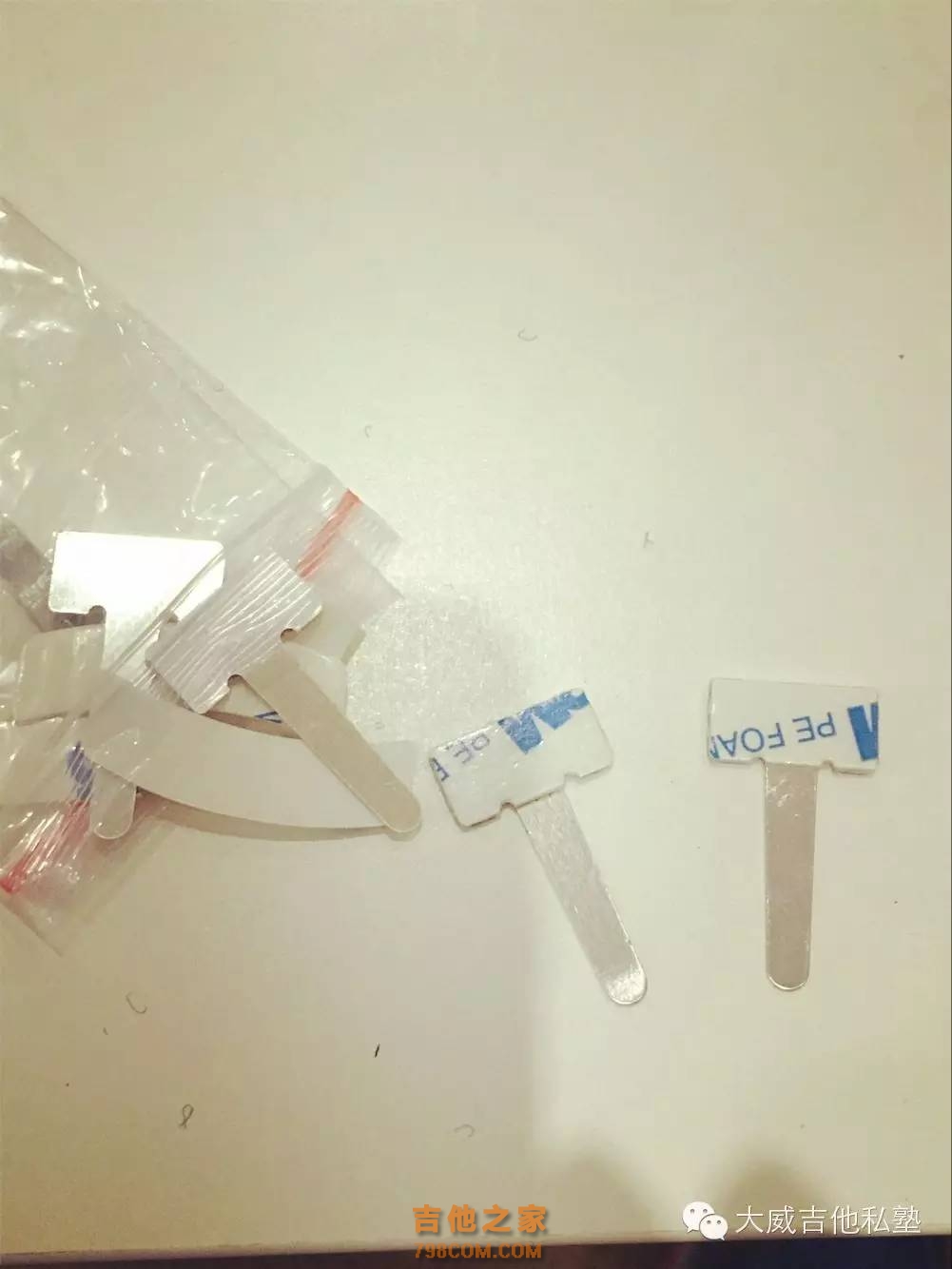 尤其要注意的是,拾音条只要稍微塞进一弦方向的孔就可以了,不用太进去。 第四步:这是调节旋钮,一个音量一个音色,大家把它粘在音孔处就可以。 第六步:我们把电池粘在琴箱内靠上面的地方,也就是琴颈和琴箱连接的地方,那个部分比较结实,面积也很大。 第七步:终于可以把琴弦上好啦。