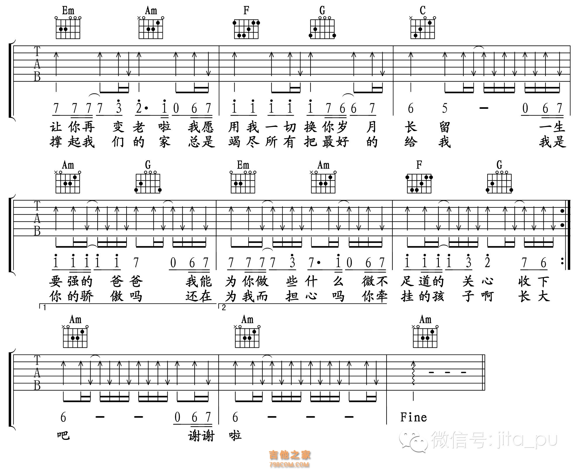 C-------F---------G--------C 总是向你索取,却不曾说谢谢你 C--------F---------G-------C 直到长大以后,才懂得你不容易 C-------F---------G---------C-Dm 每次离开总是,装做轻松的样子 C--------F---------G-------C 微笑着说回去吧,转身泪湿眼底 ----Am--Em--------F--------C 多想和从前一样,牵你温暖手掌 ----Am----Em---------F-------G 可是你不在我身旁,托清风捎去安康 ----Am------G--------Em-----Am 时光时光慢些吧,不要再让你变老了 -----F---------G--------C 我愿用我一切,换你岁月长留 ----Am-------G------Em------Am 一生要强的爸爸,我能为你做些什么 -----F------G-----Am 微不足道的关心收下吧 ----Am------G-------Em------Am 谢谢你做的一切,双手撑起我们的家 ----F---------G-------C 总是竭尽所有,把最好的给我 ----Am------G-------Em-------Am 我是你的骄傲吗?还在为我而担心吗? ----F-------G--------Am 你牵挂的孩子啊,长大啦.....