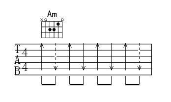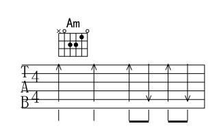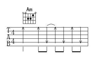 这个练习只要左手按住A和弦,右手在1—5弦匀速的“下扫”和“上挑”就可以了。 基本扫弦节奏型: