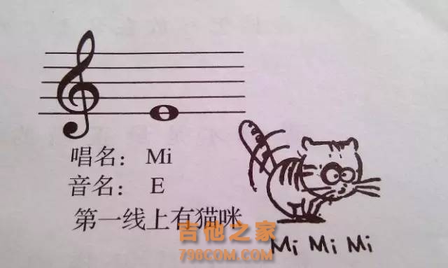 这里,首先要熟记吉他各弦的空弦音在五线谱的记谱位置: