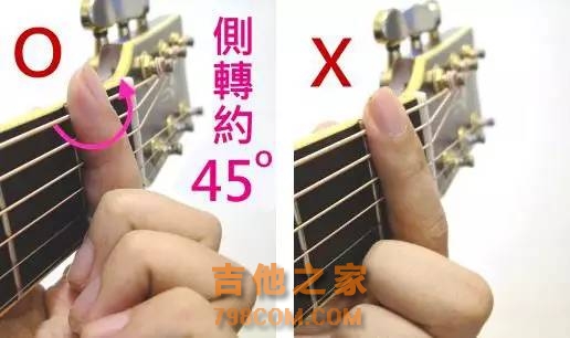大拇指位置 大拇指放在食指「正后方」,可以上下左右的微调,多尝试不同的角度,找出最适合你的位置,压好以后就要记住手感。 中指、小指位置 中指大略垂直,无名指、小指要立起来,不要去碰触到其他弦。 靠近琴衍 每根手指要尽量靠近琴衍