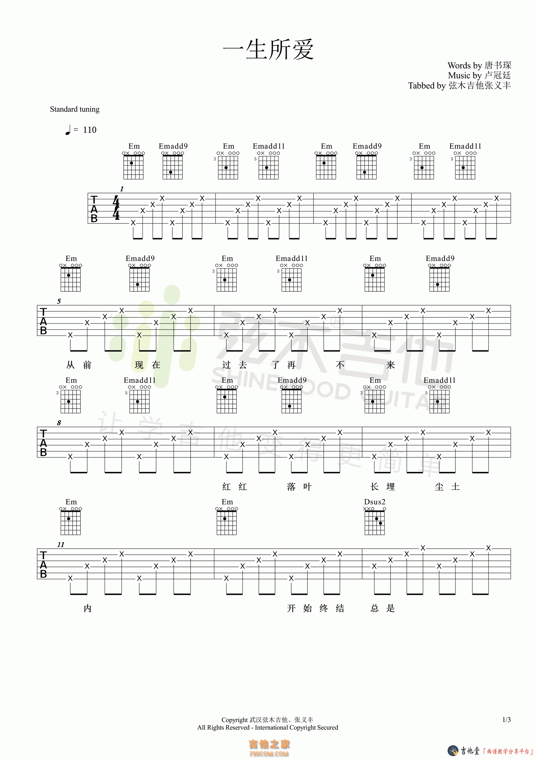 | 《一生所爱》吉他谱分享,无论是歌词所表达的意境还是歌曲本身的旋律,这首歌都无疑是不可超越的经典之作,无奈而又哀伤的一段刻骨相思之情。 谱子来自弦木吉他编配,歌曲原调不需要夹变调夹 男生唱如果觉得太高可以降半音调弦,女生唱建议变调夹夹第二品。这首歌用到了一个陌生的和弦Em(add和弦),但它非常简单,只需要用中指按住四弦相应品位就可以了。 《一生所爱》吉他演示: 其他版本曲谱:一生所爱吉他谱_演示视频_G调简单版 教学可转:卢冠廷《一生所爱》吉他弹唱教学