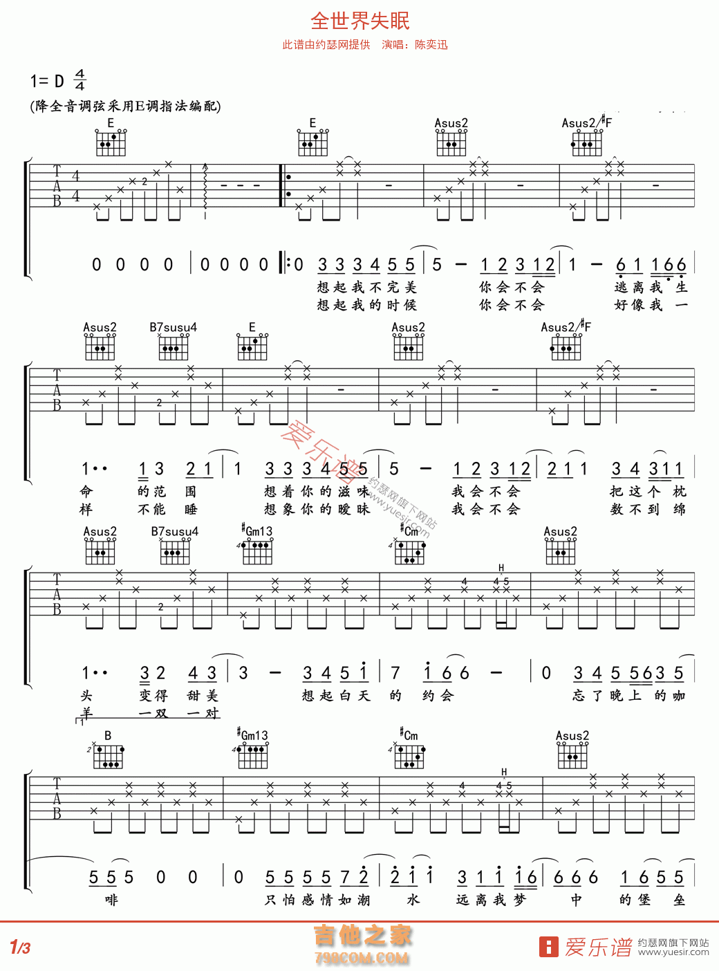 本章为“陈奕迅《全世界失眠》全世界失眠吉他谱 ”信息,了解更多高清无码版本吉他谱、尤克里里、教学视频等信息,请关注吉他之家,我们会持续更新。