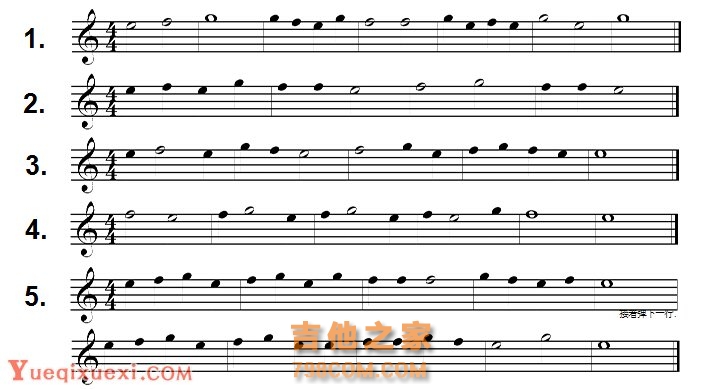 | 首先来看第一弦上的音符 下面是练习,初学者试着填出音符名,并用正确的指法弹奏。 下面是1弦练习曲 指示:这些练习曲不包含六线谱。尝试读谱然后慢慢弹奏出来。弹奏每条练习曲,记得使用正确的指法。 下面是二弦音符: 2弦练习 指示:写出以下音符的音名,用正确的指法弹奏每一个音符。用慢速来练习,每个音符用正确的节拍来弹奏。 二弦练习曲 指示:尝试读谱然后用均匀的节奏慢速弹奏,弹奏每一条练习曲,直到音符的连接很顺畅。 1、2弦练习曲 指示:用稳定均匀的节奏弹奏一下练习曲,注意使用正确的指法。 |