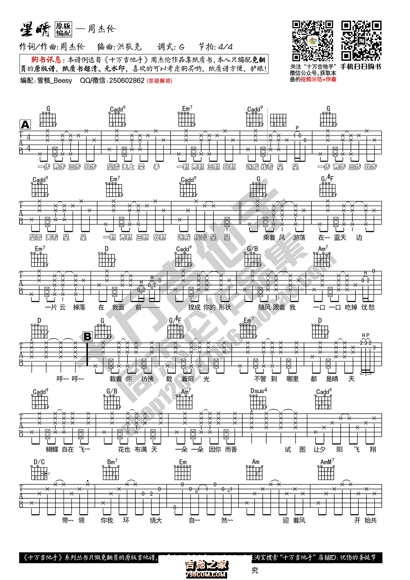 二、周杰伦《星晴》星晴吉他谱 G调原版编配