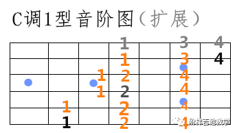 C掉的音阶;间奏当中用到了这个把位的音阶,看一下上图黑色的标记为主音,灰色的为扩展音,好好练习好这个音阶我们在本曲目演奏的时候你会明白很多