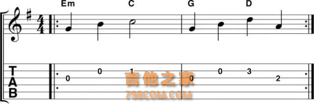 这个弹法之所以能获得传奇经典的称号,是因为有数十个经典的吉他solo都使用了这种简单的套路作为开头(Led Zep的Stairway To Heaven, Dire Straits的Sultans Of Swing,以及Cream的White Room等等)。现在你可以很轻松的将这个技巧添加到你的技术库当中。 从一个简单的推弦开始,然后在小调五声音阶当中上行或是下行。在我们给你的例子当中,我们的音阶是由下到上,再从上到下。但是你也可以尝试加入你自己的想法。 3. 走低音 在低音弦上演奏弦律