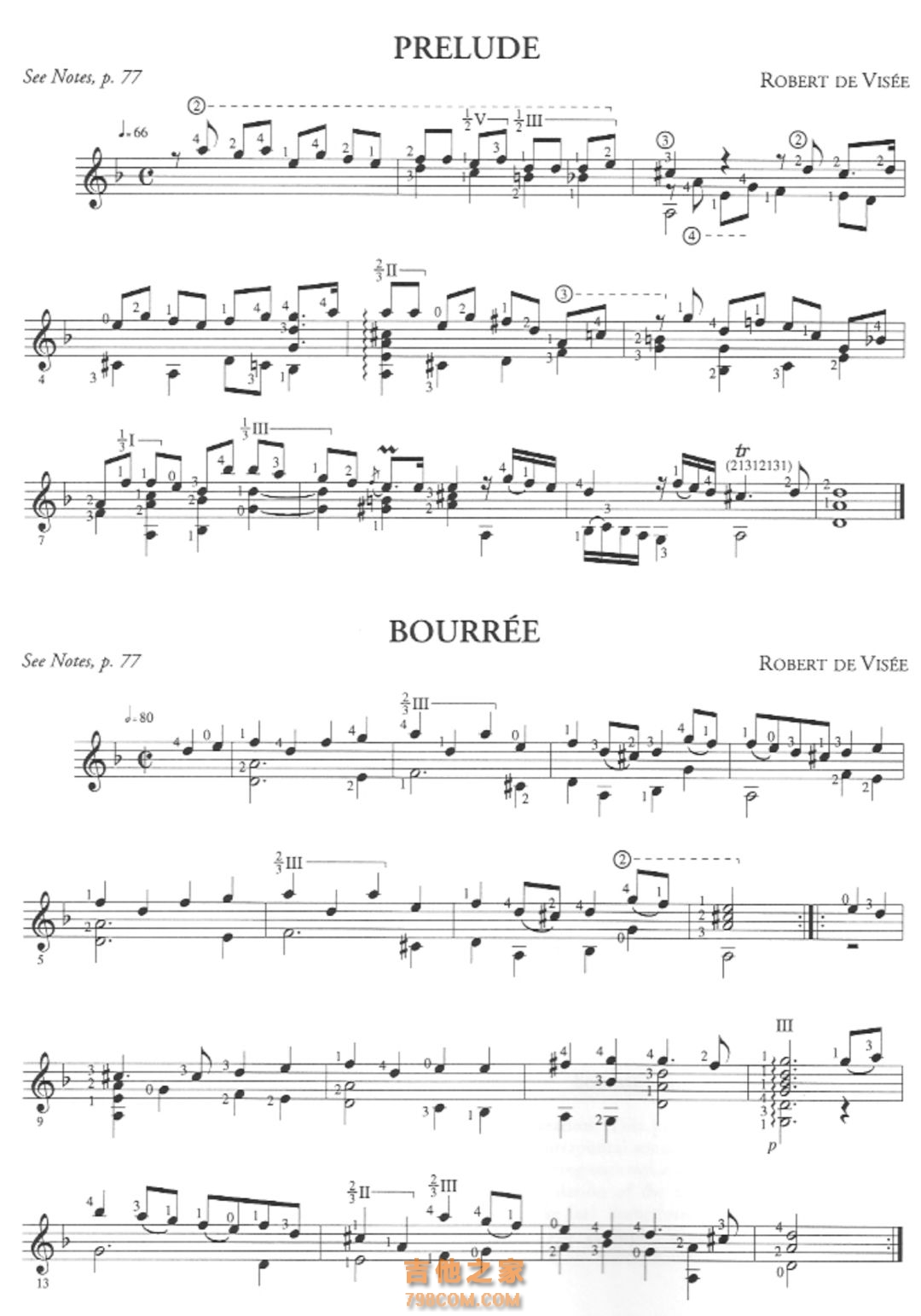 接上期:文艺复兴时期曲目解说 | 吉他大师帕肯宁教学连载(88) 巴洛克时期 (1625-1750) 大多数人基本认同巴洛克时期主要以伟大作曲家巴赫为时代标志,这一时期音乐水平无论在声乐还是器乐方面都有重大发展。装饰华丽,即兴颇多,富于韵律。我们今天所采用的大小调的系统理论,都是由当时的调性平均规律发展而来的。那时的作曲家多得到教会或上层贵族们的慷慨赞助。音乐形式包括初期的协奏曲、奏鸣曲、变奏曲、赋格曲、圣歌、合唱、清唱剧和咏叹调等。还有一种重要体裁就是组曲,基本或部分包括以下组成部分:前奏曲、阿莱曼德、库朗特、萨拉班德,以及即兴增加的舞曲(小步舞曲、加沃特、布列等)和吉格。乐曲的构成采用了诸如谐音和对位织体、强度突变、节奏控制,和一些这一时期特有的奇异旋律。伴随着小提琴、大提琴、鲁特琴独奏的流行,键盘乐器开始兴起,而今天吉他音乐的演化也是以巴洛克吉他音乐为基础的。 著名作曲家:阿比罗尼、巴赫、巴策拉尔、坎皮恩、科比塔、科莱利、哥白林、德.穆西亚、德.维塞、高蒂埃、弗雷斯科巴第、弗洛伯格、亨德尓、洛基、卢利、蒙特威尔第、普瑟尔、拉缪、隆卡利、桑斯、斯卡拉蒂、特里曼恩、维瓦尔第、维斯。 Notable Composers: Albinoni, Bach, Batchelar, Campion, Corbetta, Corelli, Couperin, de Murcia, de Visée, Gaultier, Frescobaldi, Froberger, Handel, Logy, Lully, Monteverdi, Purcell, Rameau, Roncalli, Sanz, Scarlatti, Telemann, Vivaldi, Weiss. 演奏提示 德·维塞-前奏曲和布列舞曲 (p80)