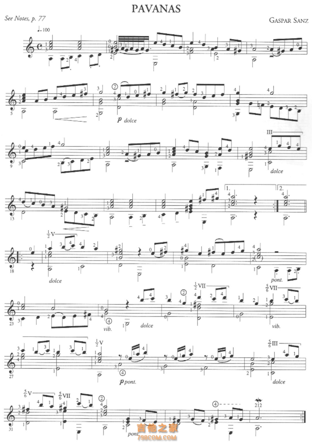 曲目解说:这首《前奏曲和布列舞曲》选自《d小调组曲》。前奏可以比较自由的发挥,乐句之间要控制好时值。大部分乐句都从小节的第二个八分音开始。请注意第5小节的问答式的乐句,它由四个音组成的旋律主题在小节第二个八分音展开,然后以随后的四个八分音作答。同样的例子也可见于第6-7小节,表现这种对答需要突出主题的动态感和节奏感。 布列部分尽量采用中速的舞蹈般的节拍。在1-3和5-7小节的第一拍考虑用轻缓的弹法。在9-11小节,尽管低音声部呈下行走向,但力度却是渐强,并在11小节的第3拍达到顶峰。在回落到主题进行之前的第13小节的第1拍,可作短暂停留,再用揉弦弹出最高音。 演奏技巧:前奏曲一开始指法在2弦上运行,因为需要音色的温暖和便于更多的揉弦。8小节的波音为F-E-F-E, 之前的节拍要确定好指法,再将2指放到F。第9小节的颤音应从更高的那个音开始(如D-C#-D-C#等),并往后略微加快,注意2,3指之间转换要掌握好连贯和速度。 布列不是太难。第3小节圆滑音降到下一根弦(类似靠弦),这时要做到平均。注意11小节指法比较特殊,F#上的4指先变成G的引导指,然后在后面的和弦转换中又充当了保留指。根据需要,该小节第二拍的Gm和弦可以用横按指法取代。随后的小节里的Gm和弦可采用大横按,并用拇指指肉位置拨弦。 结束部分的15小节第三拍,在2弦的D使用纵向揉弦(动作与品条平行),使之听起来象渐强的幻想的感觉,揉弦可稍作延长,逐渐放慢并加大幅度,此处上下往返推动,绷弦2-3次最为有效。 桑斯-帕凡舞曲(p.81)