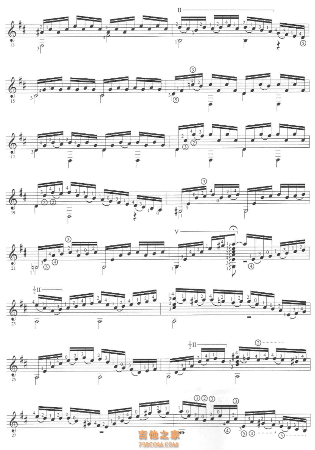 曲目解说:这是一首高低两个声部对照进行的奏鸣曲。保持节奏的稳定,每个音都要保留足够的时值。在旋律的一些节点上要求得一种明亮、舞蹈般的变化感觉,时而用断奏,时而用连奏。比如重复的音(如15,23,25小节等),使用断奏更好。有些节点加上圆滑音,则更增强了音的表达的丰富性。 尝试表现乐句之间的对话,比如7-8小节和9-10小节,这些乐句进行基本都从不完全小节开始,要表现出下一句(9-10小节)是在“回答”上一句的效果。整首乐曲都由类似这样赞美般的乐句构成。 斯卡拉蒂在这首乐曲中频繁地使用了倚音。请注意第16,17,18,30和32小节的前两拍,都有一个更小的音符,而后面大音符的音才是决定性的节拍,第一个音是“倚靠”在第二个音上的。稍微弱化倚音是为了强调主音(这是为了保证节拍的自然,因为主音才是往下的正拍)。 演奏技巧:第24和62小节的音要表现得优雅有一定难度,需要单独的练习。要做到清脆和清晰,不要打乱了旋律节奏的鲜明。第24小节,如果把2指留在原地为下一小节G和弦置指的转换作好准备,则方便许多。波音往上进行到音阶的下一个音,然后再回到开始的音,例如,8小节要弹成D-E-D. 第19-20小节拇指拨弦要给予一定强度和色调的变化,整拍都可运用。另外64小节的滑音过渡到较高把位的指法时,要营造出一种温暖的艺术效果。36,40,74和78小节左手顺势做出的滑音,实际上与使用圆滑音没有多大区别。 注意第41小节特殊的跨弦圆滑音,弹出G#后再在相邻弦上敲击出F#。4弦上最初的D#弹响后,声音须持续下去,其功能变成了后面旋律的伴奏。塞戈维亚就经常使用跨弦圆滑音,以保证旋律线的连贯。而更多时候他则使用同一弦上的圆滑音,右手完全不用弹弦。 我奏出的音符是手写的,但音乐却是神创的。 ——约翰·塞巴斯蒂安·巴赫 |