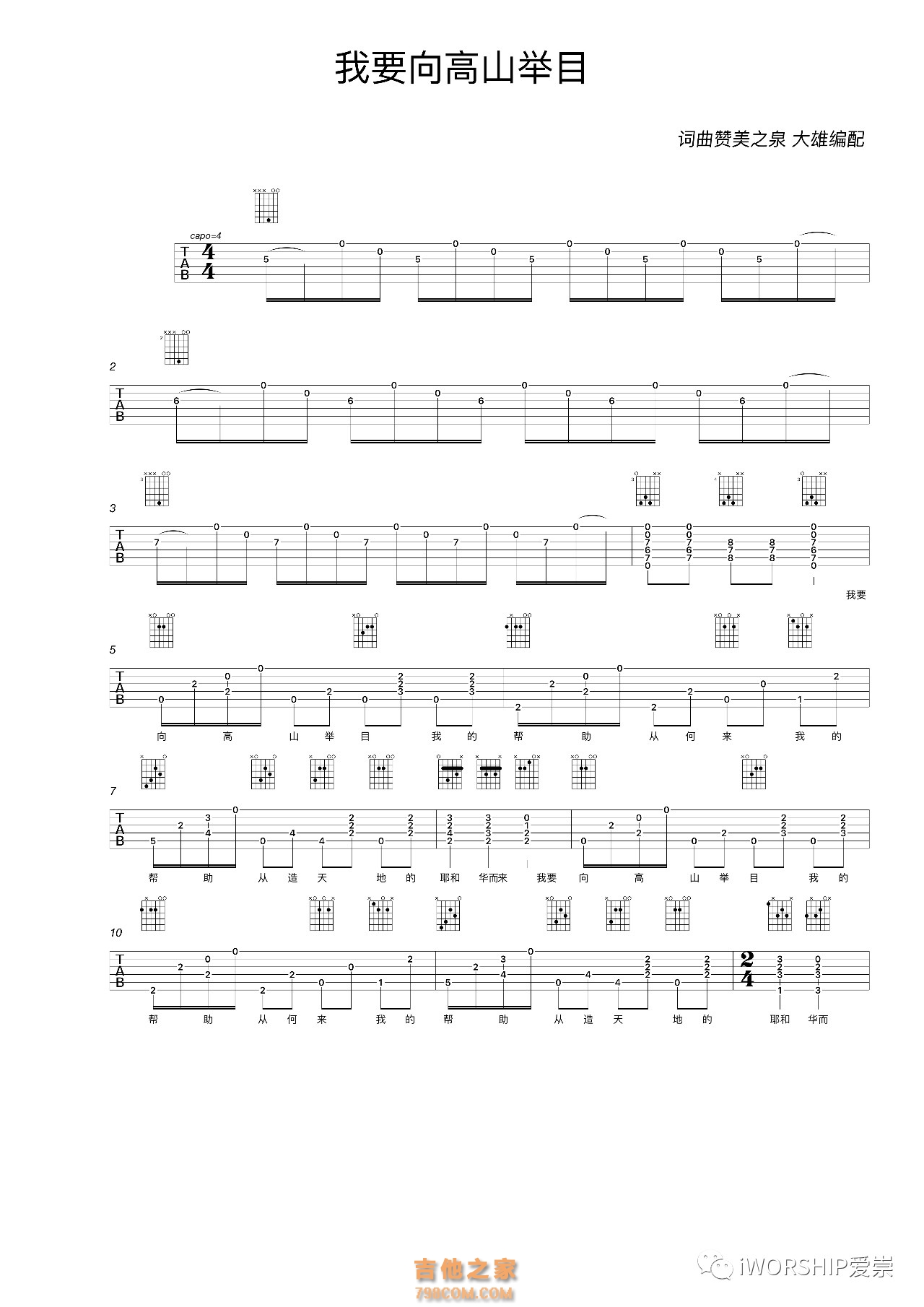 这首是来自赞美之泉的“我要向高山举目”,原调是D,我是用A调的指法来弹的,变调夹需要夹在第四品,所以是#C调。 |