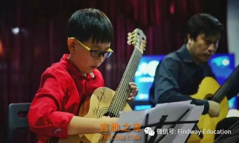 我学琴的道路也不是一帆风顺的,其中遇到过许多困难:在我上第一节民谣吉他课时,手指因为按弦而磨破。回到家练习时,我感觉学不下去了,产生了放弃的念头,这时奶奶鼓励我说:“完事开头难,一定要坚持下去。”听了她的话后,我恢复了自信,又继续坚持练了起来。渐渐地,我学到了和弦,开始了手指扩张的训练......在我遇到不会的问题时,我就会去问老师,遇到不熟练的曲子我会不断反复练习。慢慢地,我就可以弹唱一些歌曲了。 偶然的一次,爸爸的朋友建议我去接受一种更为规范吉他教学,并且推荐了韩老师,从而让我与古典吉他结缘了。第一次试听课时,韩老师让我随便弹一首看看,我便弹唱起了《童年》。随后,韩老师拿过琴来,给我弹了一首索尔的《月光》,这一比较真是天壤之别啊!与老师的琴声相比,我弹得简直就是噪音。从此以后,我就开始坚持古典吉他的学习和训练了。