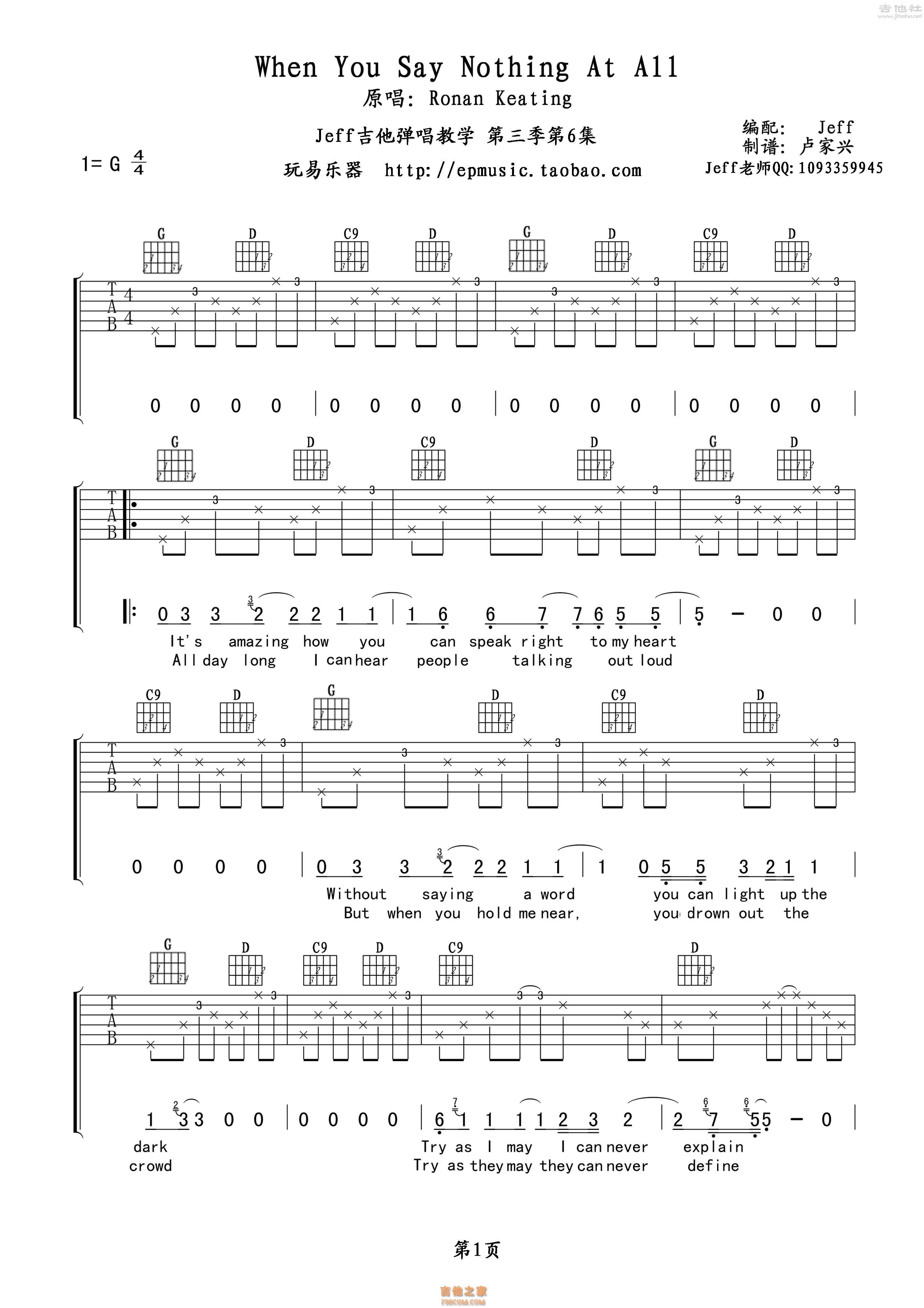 吉他之家为您提供:玩易G调版《WhenYouSayNothingAtAll》吉他弹唱六线谱 ,查看更多玩易G调版《WhenYouSayNothingAtAll》吉他弹唱六线谱 图片谱、C调吉他谱、D调吉他谱、E调吉他谱、F调吉他谱、G调吉他谱、A调吉他谱、B调吉他谱、TXT吉他谱版、GTP吉他谱版、玩易G调版《WhenYouSayNothingAtAll》吉他弹唱六线谱 简谱、玩易G调版《WhenYouSayNothingAtAll》吉他弹唱六线谱 尤克里里谱、六线谱、五线谱、吉他和弦谱及玩易G调版《WhenYouSayNothingAtAll》吉他弹唱六线谱 吉他教学视频,请查看下方"相关阅读"。