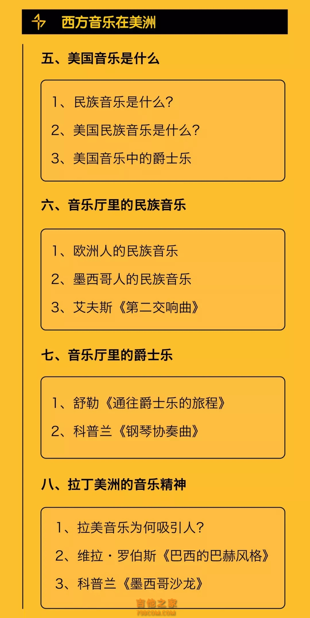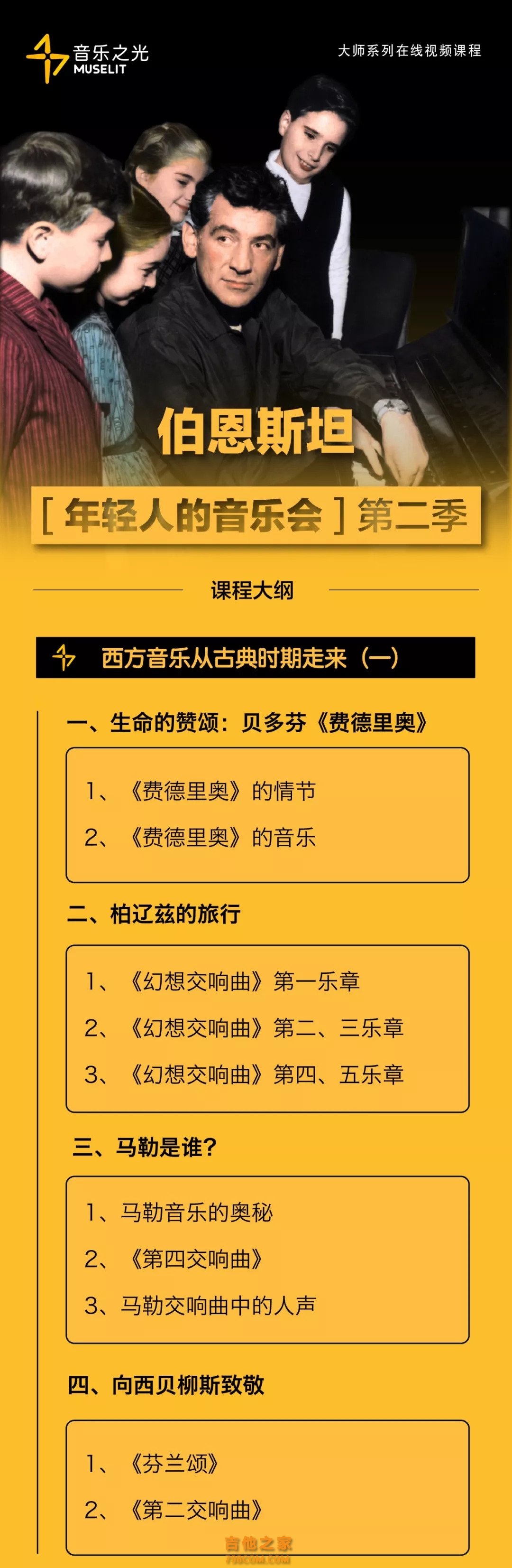 第七号练习曲(e小调Tres anime)是一首所谓“名人秀”的练习曲,技巧相当困难。最初音阶式乐句所做出的紧张感,一直延续到由分解和弦所成的中间部。此一分解和弦中乃巧妙应用了空弦,一面在第一弦上清楚的歌唱出旋律。在此一相当抒情的部分,维拉-罗勃斯再度以音阶式的乐句使其成为对比,然后在后面放置一段具有强烈节奏的尾部。此一结束部分所展现的记谱法,很容易引起误解。根据我个人从作曲者亲自听来的话,此一部分是由震音与轮指(Rasg)同时弹奏。不过,维拉-罗伯斯本人的记谱法还是不够完整,另外,像塞戈维亚所采用的那样,将此一部分用分散和弦来处理也是可圈可点的。 第八号练习曲(升c小调Modere)分散和弦与圆滑奏法的练习曲。本曲中,维拉-罗勃斯乃寄情在“大提琴的诱惑”中,从序奏开始便在吉他的最低音域歌唱旋律——虽然此一旋律马上移到高音域去……。曲中分解和弦好像始终被放在中间作为桥梁一般,旋律从低音区往高音区流动,或者相反的方向,任意移行。 第九号练习曲(升f小调Tre speu anime)分解和弦与圆滑奏的练习曲。虽是应用卡尔卡西与卡路里的手法加以发展形成,但却完全有着巴西风的内容,有点类似cavaquinho(四弦小型吉他)与vivola caipira(五组复弦乡村吉他,多用于民谣伴奏)的拨弦声,带有乡村风味的怀念情绪。和第五号一样,有显眼的三度音程(其实应说为六度音程较为妥切)之连续使用。 第十号练习曲(b小调molto animato)与第七、第十一、第十二号一样的,第十号技巧上也是很大的挑战,是一首邀你走入新世界的乐曲。开头起在低音弦上夹带着装饰音型的和弦音列,系一面变更拍子3/8、4/8、5/8……一面进行。Un peu anime的部分,旋律放在低音区,高音区则如同开头的装饰音型所支配。这里可以令人联想起小鸟的咯声。回到最初乐念的地方,维拉-罗伯斯乃借助桑巴舞曲或来自非洲音乐的一种节奏,在一个极大的渐强中驱跑。本练习曲中,有一部分不妨使用右手小指。 第十一号练习曲(e小调Lento\Piu mosso\Anime\Lento)分散和弦、连续和弦、左手指扩张压弦、右手拇指使用法的练习曲。模仿大提琴的巴西风旋律,以及有些印象派作风而模仿竖琴的装饰音型,乃在本曲中形成显眼的对比。所以在这首最富于巴西风格的练习曲中,也可见来自法国音乐的影响,应该也是当然的?中间部分设有钟音(campanella)的效果,这不但从①②③弦集合了五个e音来形成颤音,更使用第④弦的d音形成对比,这在吉他的历史上可说是划时代之举。 第十二号练习曲(a小调Anime)滑奏练习曲。关于吉他奏者的手指会在吉他弦上摩擦而产生杂音的情形,我们可以听到维拉-罗伯斯亲口所说的一个想法,即他相信这种杂音可以融人音乐之中。也就是说,只要能有意识地利用这种吉他本身所带有的声音,其效果反而会相当良好。这种想法的结果,也就是第十二号练习曲的诞生。曲中前所未有的大胆性……滑奏的和弦音列,甚至一直上升到第十二把位上面去。中间部里,6、5两弦的同时弹奏,则产生出如大鼓一般的效果。以上的《练习曲集》中,最后的三曲可以说是以《三部曲》的形态所写成。其中的第三曲(第十二号),乃成为第一曲(第十号)的一种再现。还有,这三曲各自的中间部,也都与其两边的部分有极其显著的不同,这是值得一提的。另外,如前所述,在第十一号练习曲的草稿中,已可发现有若干构想被使用在第一号前奏曲中,换句话说,在第十至第十二号的练习曲中,则已预告出《前奏曲集》(一九四○年)的出现。 对于学习吉他的人而言,我想在此提一个建议,也就是要以充分的心理准备来接触这些练习曲。即使旋律听来是印象强烈的,这些乐曲的演奏仍然相当困难,所以必须要平时严格认真的练习。如果不是当做每日练习来慢慢学会,这些乐曲恐怕会与原先的目的形成反效果,进步时所看到的,恐怕也仅是一连串“非音乐性的痉挛”罢了。 第二季伯恩斯坦《年轻人的音乐会》导赏: 1、跟伯恩斯坦学音乐史 2、他们为何选择伯恩斯坦《年轻人的音乐会》第二季? 3、“如果你问我应该做一名音乐家吗?我的回答是,No!” 4、撕掉拿破仑名字后,贝多芬首演了这部歌剧 5、欣赏歌剧必备知识要点 6、伯恩斯坦如何解读贝多芬歌剧 7、“二重唱”(Duet)欣赏指南 8、柏辽兹如何描述听音乐的感受 9、瓦格纳如何解读贝多芬的唯一歌剧 10、柏辽兹《幻想交响曲》欣赏指南 11、西方标题音乐发展简史 12、柏辽兹的贡献是什么 13、《虎口脱险》中的柏辽兹 14、马勒《第四交响曲》极简指南 15、指挥家眼中的马勒《第四交响曲》 16、伯恩斯坦论马勒的两面性 17、伯恩斯坦论马勒的左脚与右脚 18、西贝柳斯《芬兰颂》极简指南 19、西贝柳斯与他的《第二交响曲》 20、德沃夏克在美国 21、天不降格什温,美国音乐长如夜 22、格什温《一个美国人在巴黎》导赏 23、科普兰《阿巴拉契亚之春》欣赏指南 24、安德森《打字机》欣赏指南 25、巴托克《乐队协奏曲》欣赏指南 26、伯恩斯坦论艺术的价值 27、来了, 现场版伯恩斯坦式《年轻人的音乐会》 28、伯恩斯坦说:“在静默中,每一个人都是诗人。” 29、伯恩斯坦与美国文化特质 30、什么是美国的“第三潮流”音乐 31、一场离经叛道的演出 32、理想中的音乐课,它会是…… 33、聆听伯恩斯坦的马勒《第五交响曲》
