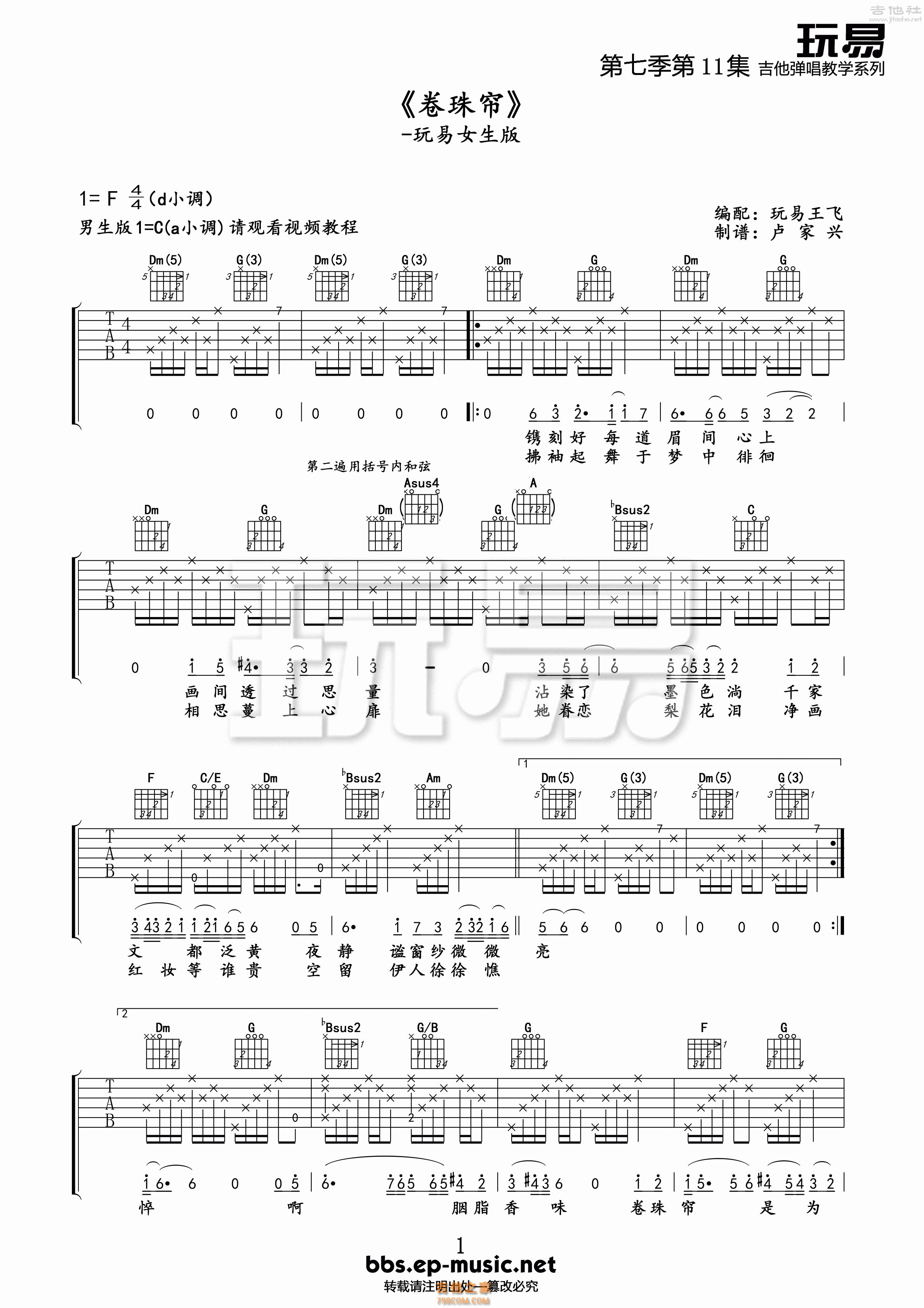 本章为“玩易F调女生版霍尊《卷珠帘》吉他弹唱六线谱 ”信息,了解更多高清无码版本吉他谱、尤克里里、教学视频等信息,请关注吉他之家,我们会持续更新。