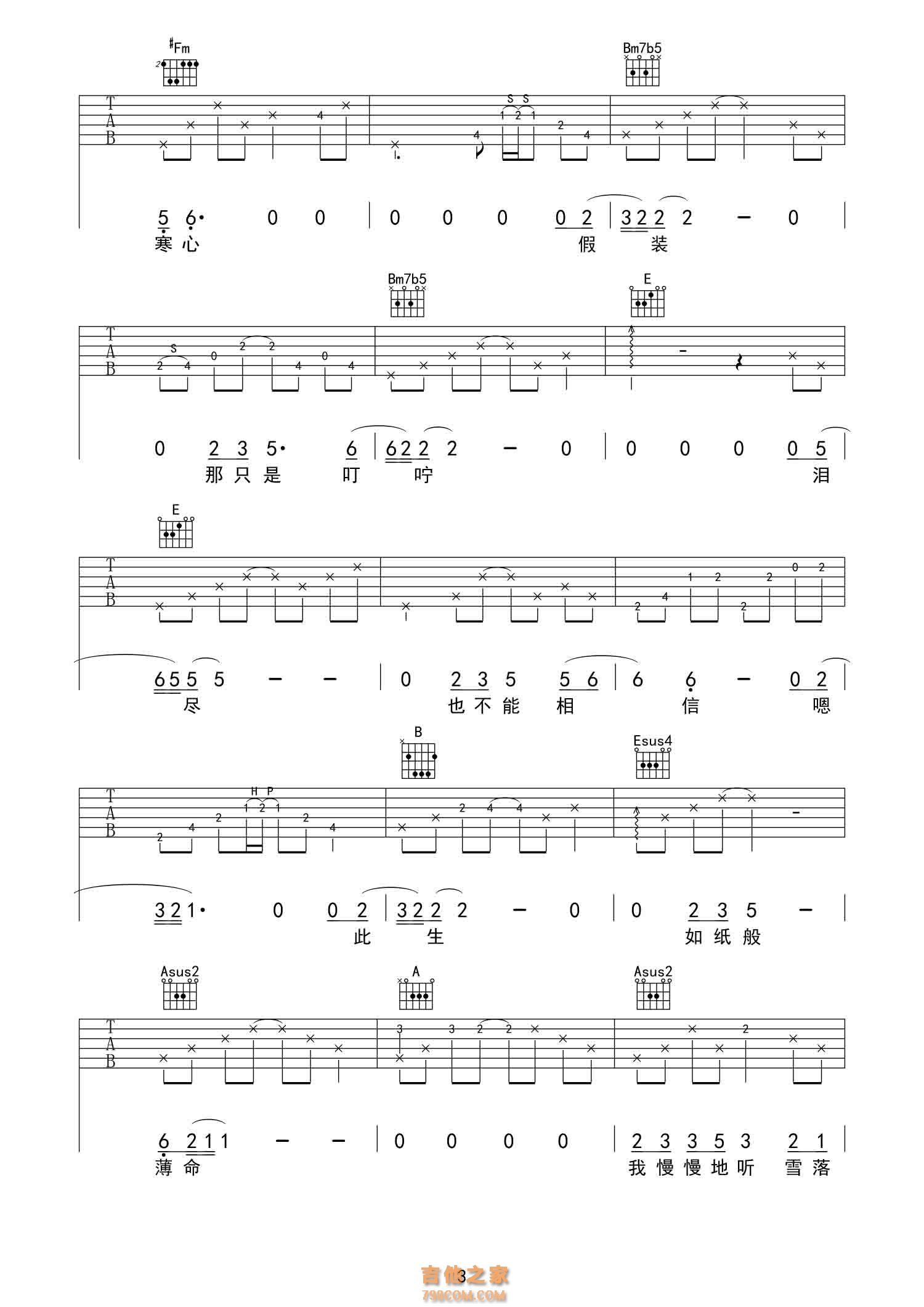 | [热门弹唱谱]秦岚《雪落下的声音》雪落下的声音B调吉他谱 秦岚《雪落下的声音》歌曲歌词 轻轻 落在我掌心 静静 在掌中结冰 相逢 是前世注定 痛并 把快乐尝尽 明明 话那么寒心 假装 那只是叮咛 泪尽 也不能相信 此生 如纸般薄命 我慢慢地听 雪落下的声音 闭着眼睛幻想它不会停 你没办法靠近 决不是太薄情 只是贪恋窗外好风景 我慢慢地品 雪落下的声音 仿佛是你贴着我叫卿卿 睁开了眼睛 漫天的雪无情 谁来赔这一生好光景 明明 话那么寒心 假装 那只是叮咛 泪尽 也不能相信 此生 如纸般薄命 我慢慢地听 雪落下的声音 闭着眼睛幻想它不会停 你没办法靠近 决不是太薄情 只是贪恋窗外好风景 我慢慢地品 雪落下的声音 仿佛是你贴着我叫卿卿 睁开了眼睛 漫天的雪无情 谁来赔这一生好光景 谁来赔这一生好光景 谁来赔这一生好光景 |