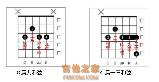 拓展一些四音以上的和弦 如果属七和弦再往上罗列就有了属九和弦了,它是由根音、三音、五音(可省略)、降七音、九音(二音)组成的。 在往上会有十一和弦,到了十三和弦就到顶了,C13有1、3、5、b7、2、4、6音组成,我们只要把三音、七音、十三音勾勒出来,十三和弦的属性就能体现出来了。