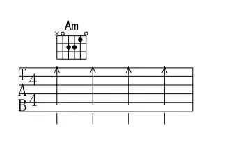 要求:来回扫弦力度要均匀、速度要平稳,不宜过快,能够用脚打拍子或用口令数拍子(一、二、三、四)那最好了。下面的练习都是由这个练习演变而成的,都以这个练习为基础的,无论他们的节奏怎么变化,右手来回的运动都应该要匀速、流畅。只有这样才能保证节奏的准确性。 练习一: