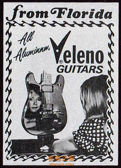 Veleno guitar的创始人John Veleno在1970年就开始制作空心铝吉他—Veleno这把全金属吉他带有铝铸颈部,手工雕刻的琴身,并配以明亮的阳极氧化颜色。为了让它更具美感,John Veleno给它设计了一个浮夸的V形琴头,并且在上面镶嵌了一颗红宝石。