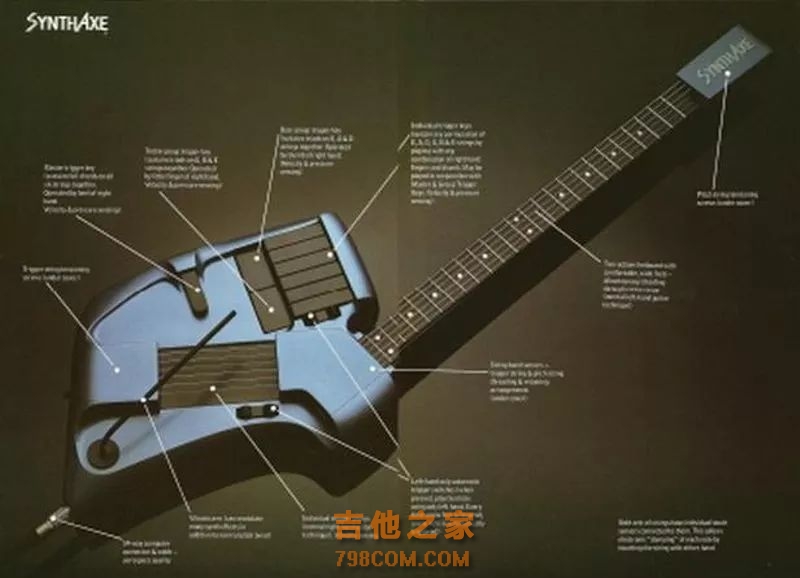 合成器产物 ---SynthAxe (1984) 80年代是合成器的年代。在70年代各种奇异的创新后,80年的创新则是连接吉他和合成器。其中最引人注目的是SynthAxe,这是1984年出产的一款合成器吉他。