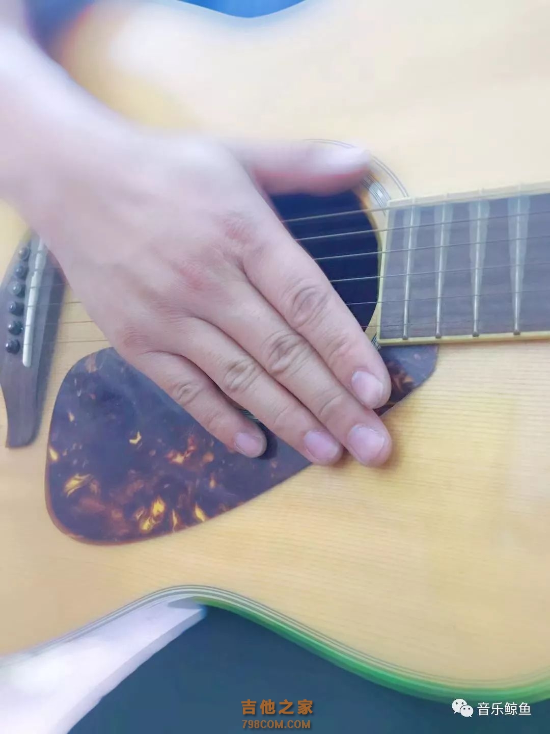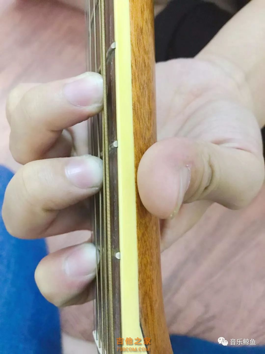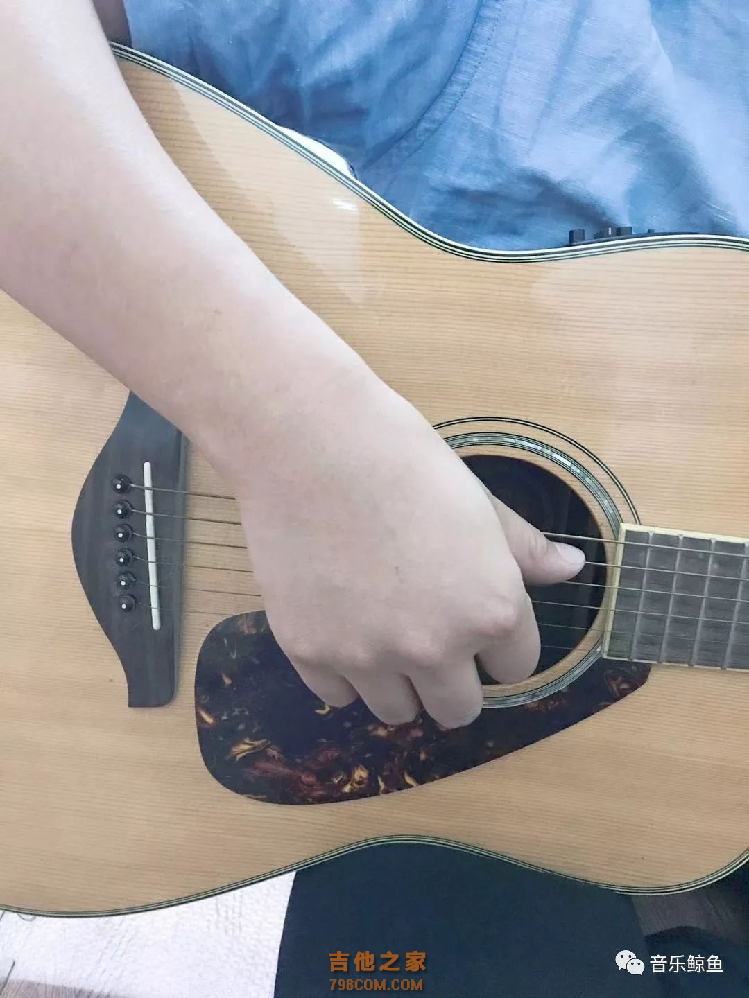 按的时候要记住,大拇指始终比其他手指多出一个指甲盖的位置。 如果你是缺角吉他,那你的手指伸直刚好对在缺角的正中间。如果你是圆角吉他,那你的手指伸直刚好对在圆角的最高点。 当我们把手指缩起来放在弦上的时候就是如上图的样子,手背基本和琴面平行。