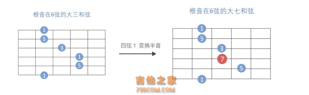 但很多人弹 F 和弦其实都不知道自己在弹什么音,这是知道这样按而已,所以现在你要知道,这个东西就是根音在 6 弦的大三和弦,当你食指横按在 1 品的时候,6 弦 1 品的音就是 F,这个和弦就是以 F 音为根音的大三和弦。所以只要固定这个指型,用食指去找到 6 弦上不同的音作为根音,你就能得到不同的大三和弦,现在你已经学会了 11 个大三和弦了。 然后是大七和弦,我们把 4 弦上的 1 变成 7,这样我们左手按的音就变成了大七和弦所需要的 1 3 5 7 了。