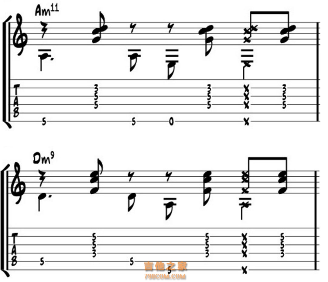和弦音用食指、中指、无名指在2-4弦弹出,低音用拇指在5和6弦上交替。第4拍这里有一个hit,目的是为了增加一定的节奏效果。如果觉得弹奏有困难,我建议你分开弹奏低音和和弦或是将一小节分成两个部分单独练习。 下面是Am11、Dm9、G13和弦模式的细节,注意这些和弦的低音不在一根弦上,但是高音和弦都是同样的3根弦: