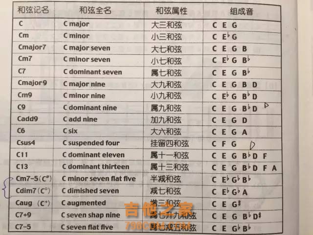 | 吉他和弦编配初级教程(一) 2017-07-08 第一部分:傻瓜式和弦编配:基本乐理与乐理的应用 本部分分为两部分内容,第一部分是必学的基础乐理,有这些基础后进入第二部分的实战应用 01 初学者必学的乐理 已经会基础乐理的请直接跳到后面的应用部分 首先,我建议在吉他弹奏至少在能达到简单自如弹唱时再去学乐理,对于初学者来说,一开始不要学太多,真的会忘记,也难懂,咱只学习能实际用到的,包括以下几部分内容,剩下的以后再学,一定要边学边用,学以致用。 必学要点: 1.掌握音程:“大二度”,“小二度”,“大三度”,“小三度”的概念; 2.大调音阶的音程关系与各种表示方法; 3.大三和弦,小三和弦,大七和弦,小七和弦的和弦组成。 1 大调音阶的音程关系与各种表示方法 简谱:1 2 3 4 5 6 7 1 音名:C D E F G A B C 级数:I II III IV V VI VII(也可以用阿拉伯数字表示为1级,2级。。。7级) 音程关系分别为:1到2为大二度,也称全音,2到3为大二,3到4为小二,也称半音,4到5为大二,5到6为大二,6到7为大二,7到1为小二。 一个全音=2个半音,详见第二条内容。 记忆规律:只需记住3到4与7到1为小二度(半音),剩下的都是大二度(全音)。 2 掌握音程:“大二度”、“小二度”、“大三度”、“小三度”的概念 小二度:在吉他上前后两个音连续,中间不空品格,比如3与4, 7与1。 大二度:在吉他上前后两个音中间空一格(品)。 小三度:小二度+大二度,比如3与5,3与4是小二度,4与5是大二度。 大三度:大二度+大二度,比如4与6,中间隔着5,4到5是大二度,5到6也是大二度。 剩下的比如纯四度,增四度啥的,有兴趣的可以了解下,没兴趣的直接跳过,以后再说,但不管怎样,附图如下。 基本音程乐理知识,这里咱主要用到“大二度”,“小二度”,“大三度”,“小三度”。 3 大三和弦、小三和弦、大七和弦、小七和弦 大三和弦:根音+大三度+小三度,如C和弦1 3 5,其中1与3之间为大三度,3与5之间为小三度,其中根音为1。 小三和弦:根音+小三度+大三度,如Em和弦,3 5 7,其中3与5之间为小三度, 5与7之间为大三度。 大七和弦:大三和弦基础上再+小三度,比如C7和弦为1 3 5 b7 小七和弦:小三和弦基础上再+小三度,比如Em7和弦为3 5 7 2 规律:大和弦和小和弦之间的差距主要在和弦的“三音”。 剩下的比如增和弦、减和弦、九和弦啥的,有兴趣的可以了解下,没兴趣的直接跳过,以后再说,但不管怎样,附图如下。 头晕了吗?先晕着吧,再晕一小会就好了,慢慢往后看,注意学以致用,就不会再晕咯,这里最好找一位前辈或者老师协助学习。 02 实战:傻瓜式和弦编配法 1.首先要知道一个调式里最常用的几个和弦,也就是顺阶和弦 就是将“1 2 3 4 5 6 7 1 2 3 4 5 6 7”里自然排序组成的啦,每隔一个音抽出三个音,如下,以C调为例: 1级C和弦(又叫大调主和弦):组成音1 3 5大三和弦,用在歌曲的乐曲开头和结尾,色彩明朗,宽广。 2级Dm和弦:2 4 6小三和弦,m是minor小的意思,色彩柔和。 3级Em和弦:3 5 7小三和弦,色彩暗淡。 4级F和弦(又叫副属和弦):4 6 1大三和弦,有种突然“飞起来”的感觉。 5级G和弦(又叫属和弦):572大三和弦,和弦主要框架。 6级Am和弦:613小调主和弦用在小调歌曲开头和结尾色彩暗淡,抑郁悲凉。 7级Bdim和弦:724这是减三和弦,很少用,初级同学咱跳过,一般用G7替代。 总结:常用和弦就有:I级,II级小和弦,III级小和弦,IV级,V级,VI级小和弦,以C调为例子就是C Dm Em F G Am这六个,以G调为例子就是G Am Bm C D Em #Fm ,具体请参考我的《吉他手的武林秘籍6》。 傻瓜式用法一:分析一小节乐句里主要的音,比如这小节音是“1 3 5”,那很自然的就可以用I级C和弦啦! 傻瓜式用法二:代入法,一小节一小节的去试验,边弹边听,6个和弦都试一遍,哪个好听选哪个,一般情况下,只要歌曲不那么复杂,这6个和弦里总有个是的! 请牢记这两种傻瓜式用法,下面我们来一个编配实例! 《送别》初级版和弦编配 友情提示 来看这首歌的简谱,bE调的,咱们按C调编曲,然后分析,这是4/4拍的,我们可以以2拍为一个单位去分析这2拍内的音符并进行和弦编配。 第一小节:既然是C调,那么第一个和弦基本就是C了(有时直接以副歌进的歌曲除外哦),第一小节主要音就是“1 3 5”,这不就是C和弦的组成音嘛。 第二小节:分两部分,前2拍是“6 1”,匹配的和弦有“Am(6 1 3)”与“F和弦4 6 1”,选哪个? 注意:当傻瓜式用法一遇到障碍,那就用傻瓜式用法二来解决,两个和弦都试一下,哪个好听?当然是F和弦好听,第二小节妥妥的就是IV级F和弦了。 第三小节:主要音仍然是“1 3 5”,其中的“2”音只能算过度,所以这部分没啥疑问,I级C和弦搞定整个小节。 第四小节:就只有一个“2”音哦,这里有一个窍门,一段乐句进行到一半时通常有一个“半终止”,就是那种你感觉这首歌还没结束的,这里通常用V级属和弦,也就是G。 第5-8小节类似,此处对比下第二行最后一小节,回到主音“1”,所以第二小节最后一个和弦应该是主和弦C,一个乐段“全终止”(注意不是整首曲子全终止哦)。 此处注意第7小节:也可以分两部分,前半部分是“5 2 3”,其中5一拍,2、3各半拍,你既可以看成是主要音为“2 5”也可以看成是“3 5”,所以这里用“C”与“G”和弦都是可以的,自己挑吧,后半部分是“4 7”,能符合的只有七级“7 2 4”,但七级一般用五级属七和弦代替也就是G7“5 7 2 4”,所以此处用G7。 第9小节进入副歌部分,而IV级F和弦是副歌首选和弦,所以此处“