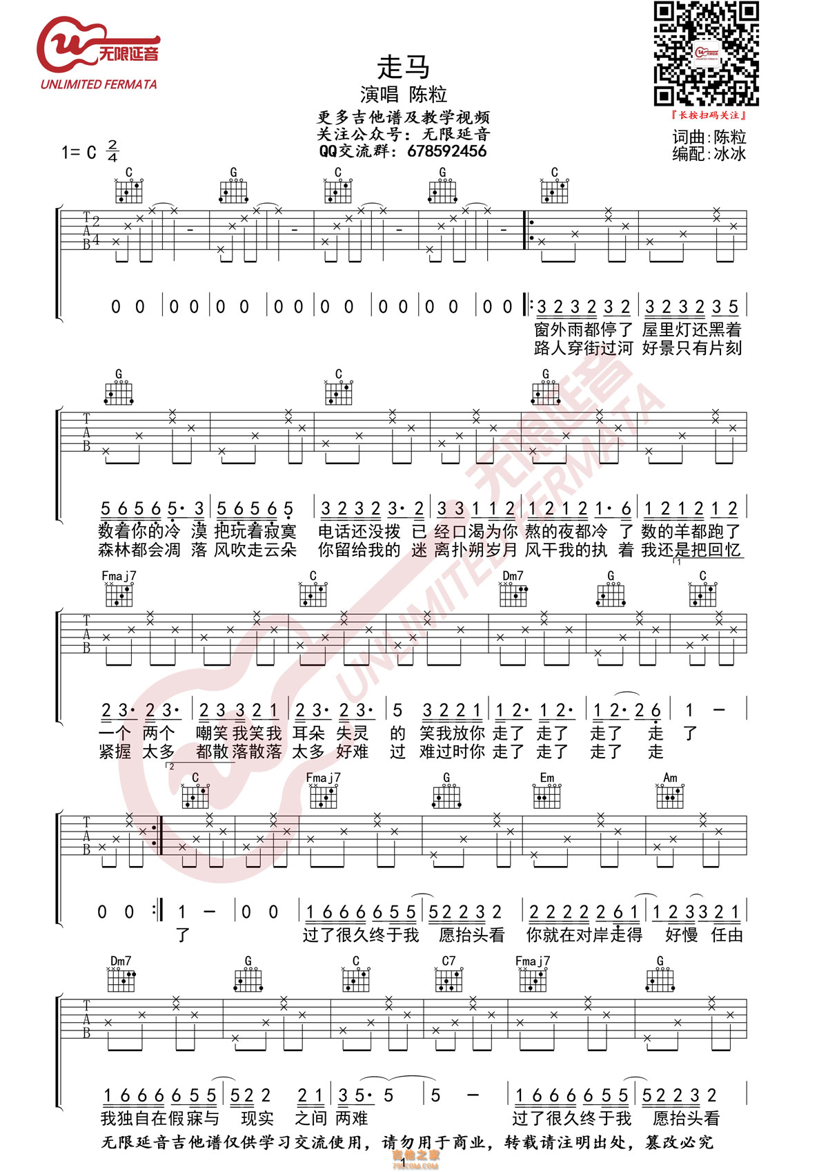 本章为“陈粒 走马 吉他谱 无限延音编配 ”信息,了解更多高清无码版本吉他谱、尤克里里、教学视频等信息,请关注吉他之家,我们会持续更新。