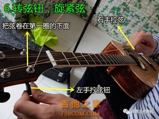 现在夏天到了,大家练琴的时候手都会出汗,汗会加快琴弦的生锈速度。换弦这个我们吉他爱好者们必须要会的这个技能就要起到重大的作用了!近期好多同学在公众号留言说需要吉他换弦的教学,那今天就给大家准备一个非常全面的换弦讲解! 这是市面上最全面的关于吉他换弦的讲解! 1文字讲解分为两部分 第一部分 理论解释; 第二部分 实战演示。 2理论部分使用卷弦器或者手松开琴弦,吉他下面三个旋钮,向琴头方向旋转即为松弦。吉他上面三个旋钮,向琴颈方向旋转即为松弦。完全松掉吉他弦