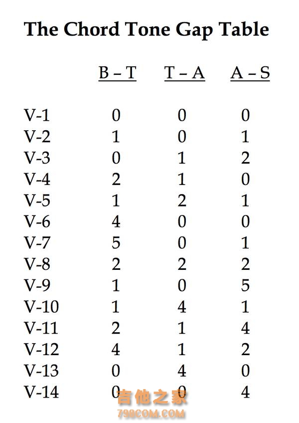 Drop2 1573, 3715, 5137, 7351 Drop3 1735,3157,7513, 5371 Drop2&4 1537,3751,5173,7315 其中357可以是b3b5b7bb7以代表maj7,minor7,7th,m7b5,dim7;这里为了简洁就不穷举了,只是说明Drop chord和弦音排列顺序。 其实学了这些下来你会发现Drop Chord玩的就是个排列组合,但没玩全;V-system呢?玩全了。 V-system分14个和弦组,任何一个4-note chord都可以细分到这14个组别中的某个,也可以反向通过14个组别去构建需要用的4-note和弦,举一反N。*这里的4-note和弦不含有任何重复和弦音,也就是每个和弦音都不一样,没有doubling。 和弦组从V1,V2,V3.......一直到V14;Ted Greene本人用了一个非常让人难受的方法去区分这十四组和弦,我就不介绍了,想想脑子都疼,有兴趣可以去Ted Greene网站观摩。大体上就是把4-note chord的四个音分为soprano,alto,tenor,和bass,分别用SATB来代表,再通过下面这个表去对应属于哪个类别的和弦。 这个方法一个明显的缺点:看着太烦了。 我个人实在不想记这么多东西,什么BTAS什么什么的,我要先记住这些,然后再把我想要构建的和弦套用到这个公式中,再反馈到指法上……说实话我背了两天,然后放弃了。 当然,我认为这个方法只是参考用,我重点介绍第二种方法。 第二种方法摒弃了Ted Greene上面这张表里用字母组合代表和弦音排列的方式,直接用和弦音之间的距离关系(spacing)去辨别和弦组别。 举个例子,1357,这是属七和弦最紧密的排列方式,你无法再往任意两个相邻和弦音中插入另一个和弦音,那这种排列方式可以看作soprano 7到alto 5之间的距离是0,alto 5到tenor 3之间的距离是0,tenor 3到bass 1之间的距离是0。 *注解一下,在Ted的V-system中,一个4-note和弦从低音到高音分别是bass(B), tenor(T),alto(A),soprano(S);不管是哪个和弦音在什么位置,高音永远是soprano,以此类推。 那么我们就用0-0-0去代表这类和弦;转念一想,3571,5713,7135也符合这个定义,只不过是以不同和弦音为根音的转位和弦,不同的voicing而已,所以实际上这个0-0-0定义了这类和弦以及它所有的转位。 接下来我们看下面这张表,刚才说的0-0-0的最紧密排列方式就是V-1。 继续往下看V-2,和弦音之间的距离关系是1-0-1 。1的意思就是两个和弦音之间隔了一个和弦音,比如属七和弦的1到5,中间就隔了一个3,这就叫1。那么按这个规则,1-0-1,我们想要构建一个以根音为bass音的V-2属七,心里一算,我们就知道应该是1573,顺便3715,5137,7351都是,因为他们都是转位,也都符合1-0-1的结构。 写到这里先打住,我想数学好的同学应该能想到其中的规律,这就是排列组合。 1357这几个和弦音,用排列组合的思路去算,除掉每种之中的其余几个转位和弦,有几种? 4X3X2X1/4=6 而这正是V-1, V-2, V-3, V-4, V-5, V8这6种。 用原位和弦去举例表示的话,那就是下面这个样子。 V-1(0-0-0): 1357 V-2(1-0-1): 1573 这就是Drop2 V-3(0-1-2): 1375 V-4(2-1-0): 1735 这就是Drop3 V-5(1-2-1): 1537 这就是Drop2&4 V-8(2-2-2): 1753 所以V-system才能包含所有4-note chord,因为排列组合所有的可能性都在里面了。 写到这里,V-1到V-5,以及V-8就都能现学现用了,接下来我来解释一下V-6,V-7,V-9到V14。 首先注意到V-6是4-0-0,也就是说V-6的bass与tenor之间相差四个和弦音,但其实数一数四个和弦音其实又回到了bass音,所以实际上4-0-0的意思是V1的bass音降低一个八度,但和弦音顺序还是1357(或者3571,5713,7135)。 明白这点剩下的就好解释了。 V-7 5-0-1 是V-2的bass音降低一个八度 V-9 1-0-5 是V-2的soprano音升高一个八度 V-10 1-4-1 是V-2的bass与tenor共同降低一个八度或者alto与soprano共同升高一个八度 V-11 2-1-4 是V-4的soprano升高一个八度 V-12 4-1-2 是V-3的bass降低一个八度 V-13 0-4-0 是V-1的bass与tenor共同降低一个八度或者alto与soprano共同升高一个八度 V-14 0-0-4 是V-1的soprano升高一个八度 所以在构建上述类别的和弦时,只要通过改变通过排列组合得出的和弦种类就可以求出。 其实理论上还可以有更多,但考虑到实际手指能够的到的情况,V14已经是极限了。 到这里我们应该已经对V-system有初步理解了,但应用上还有难度,因为对不同的V组,可能不清楚用哪些string set更适合,所以就有来下表,natural string set。 这个实际上就是告诉你那几根弦适合按什么和弦。 这里再拿V-2举例,用4321弦去构建V-2指法会很自然。 如下表,5432弦,6543弦同理。 了解V-1到V-14的构成后,理想情况下单一个属七和弦可以有多少voicing呢? 拿C7来举例,V-1, V-2, V-3, V-4, V-5, V8分别有四个(原位加转位);V-6,V-7,V-9到V14个有一个。 6X4+8=32个 这里还没有考虑用不同的string set,也就是例如V-2(也就是Drop2),可以在6543弦,5432弦,和4321弦可以有相同的voicing和不同的指法。 这只是属七,把常用的几种和弦都算进去呢? C7,Cm7,Cm7b5,Cdim7,Cm6,C6,Cmaj7 7x32=224 算十二个调 12x224=2688 (阅读至此,其实小编的内心是崩溃的……) 所以总共2688个“常用”和弦。(当然这里不包括同音不同名的和弦,比如C6和Am7,Am7实际上是C6以6为根音的转位) 但实际上的和弦数量,比这个还多不少,因为还有C7b5,C7#5,C7#9等等,加上上面说的常用的和弦种类算一算有小几十个quality。 不过有一点需要说明的是带延伸音的和弦,比如A9 no root,和弦音是35b79 。在V-system中,所有的延伸音要降八度理解,9既是2,所以和弦音实际上是235b7,然后再此基础上构建和弦,例如我要构建一个V-2以5音为根音的A9 no root,那和弦公式应该是523b7。再举个例子,省略5音的E7add 9,和弦音是13b79,也就是123b7;如果我要构建一个以b7为根音省略5音