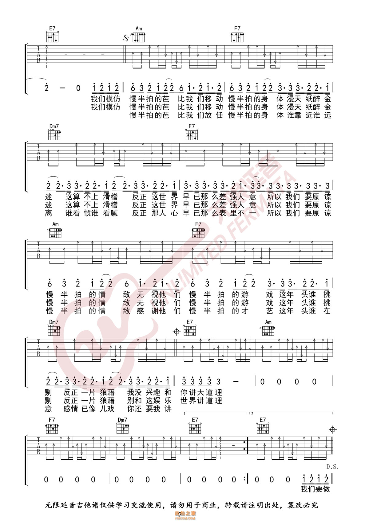 本章为“薛之谦 慢半拍 吉他谱 无限延音编配 ”信息,了解更多高清无码版本吉他谱、尤克里里、教学视频等信息,请关注吉他之家,我们会持续更新。