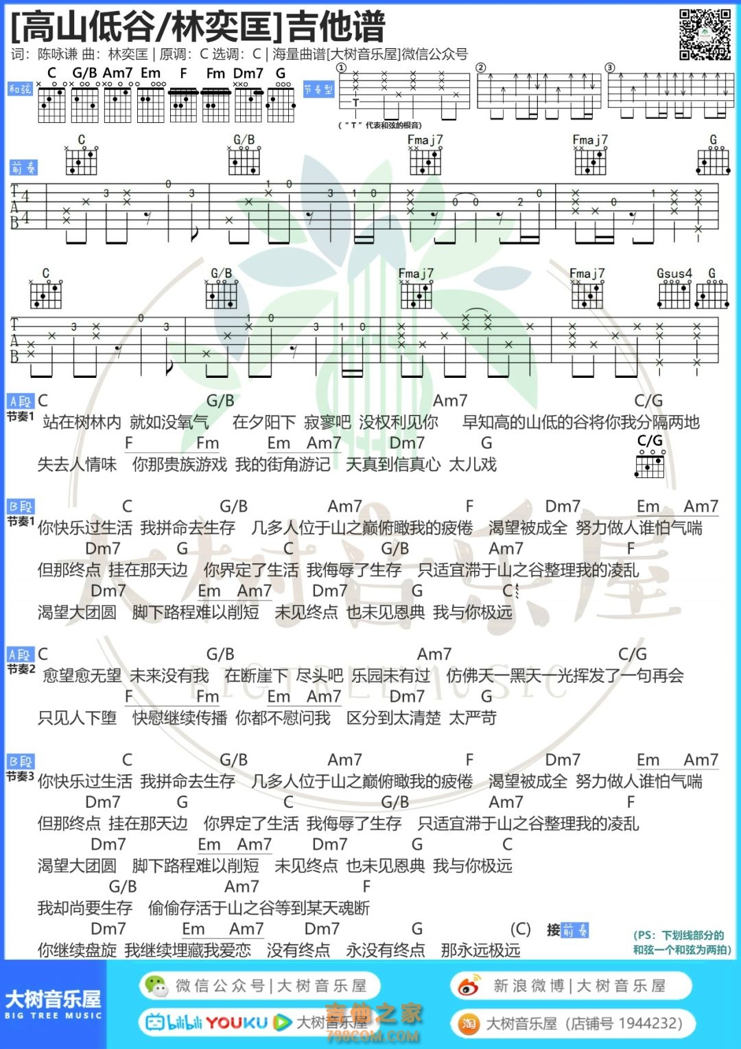《高山低谷》-林奕匡 《高山低谷》是林奕匡演唱的一首歌曲,由陈咏谦作词、林奕匡作曲,Edward Chan和黄兆铭编曲,发行于2014年4月25日,收录在专辑《3》中。2015年1月1日,林奕匡凭借该歌曲在“2014年度叱咤乐坛流行榜”颁奖礼上获得“专业推介 - 叱咤十大”第十位及叱咤乐坛唱作人银奖。林奕匡去香港做音乐的时候很有自信,他给自己2年的时间找唱片公司。幸运的是,一年半的时候就就与索尼音乐签约,发了第一张创作作品,但是因为版税的问题得不到一些重要的宣传平台。这对林奕匡来说,是一件困难的事,在香港有5年的时间,没有任何工作计划,去提款机连100块都拿不出来。林奕匡从没想过自己能到那个地步,他觉得其实是自己没有做好,所以林奕匡告诉自己一定要站起来,要回到舞台上。身为一个创作歌手,他可以写歌给自己。就不停在写,就写了《高山低谷》。吉他之家为您提供:高山低谷吉他谱·林奕匡《高山低谷》吉他谱C调 大树音乐屋 ,查看更多高山低谷吉他谱·林奕匡《高山低谷》吉他谱C调 大树音乐屋 图片谱、C调吉他谱、D调吉他谱、E调吉他谱、F调吉他谱、G调吉他谱、A调吉他谱、B调吉他谱、TXT吉他谱版、GTP吉他谱版、高山低谷吉他谱·林奕匡《高山低谷》吉他谱C调 大树音乐屋 简谱、高山低谷吉他谱·林奕匡《高山低谷》吉他谱C调 大树音乐屋 尤克里里谱、六线谱、五线谱、吉他和弦谱及高山低谷吉他谱·林奕匡《高山低谷》吉他谱C调 大树音乐屋 吉他教学视频,请查看下方"相关阅读"。