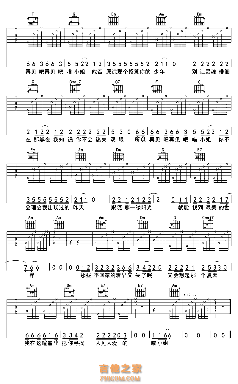 再见吧 喵小姐 吉他谱·王晓天《再见吧 喵小姐》 吉他谱E调 简介:《再见吧喵小姐》是2014年中国好歌曲.由王晓天作词作曲并演唱的原创歌曲。吉他之家为您提供:再见吧 喵小姐吉他谱·王晓天《再见吧 喵小姐》吉他谱E调 ,查看更多再见吧 喵小姐吉他谱·王晓天《再见吧 喵小姐》吉他谱E调 图片谱、C调吉他谱、D调吉他谱、E调吉他谱、F调吉他谱、G调吉他谱、A调吉他谱、B调吉他谱、TXT吉他谱版、GTP吉他谱版、再见吧 喵小姐吉他谱·王晓天《再见吧 喵小姐》吉他谱E调 简谱、再见吧 喵小姐吉他谱·王晓天《再见吧 喵小姐》吉他谱E调 尤克里里谱、六线谱、五线谱、吉他和弦谱及再见吧 喵小姐吉他谱·王晓天《再见吧 喵小姐》吉他谱E调 吉他教学视频,请查看下方"相关阅读"。