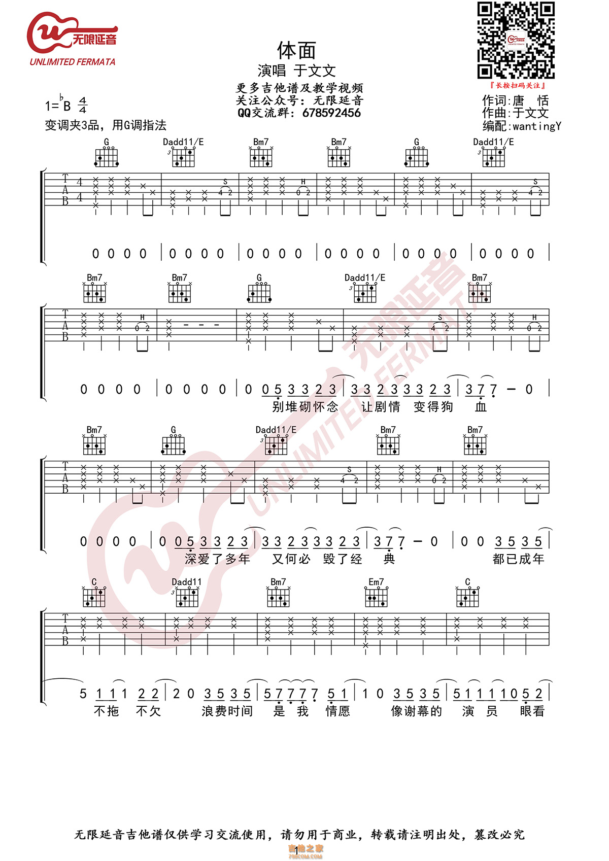 本章为“于文文 体面 吉他谱 无限延音编配 ”信息,了解更多高清无码版本吉他谱、尤克里里、教学视频等信息,请关注吉他之家,我们会持续更新。