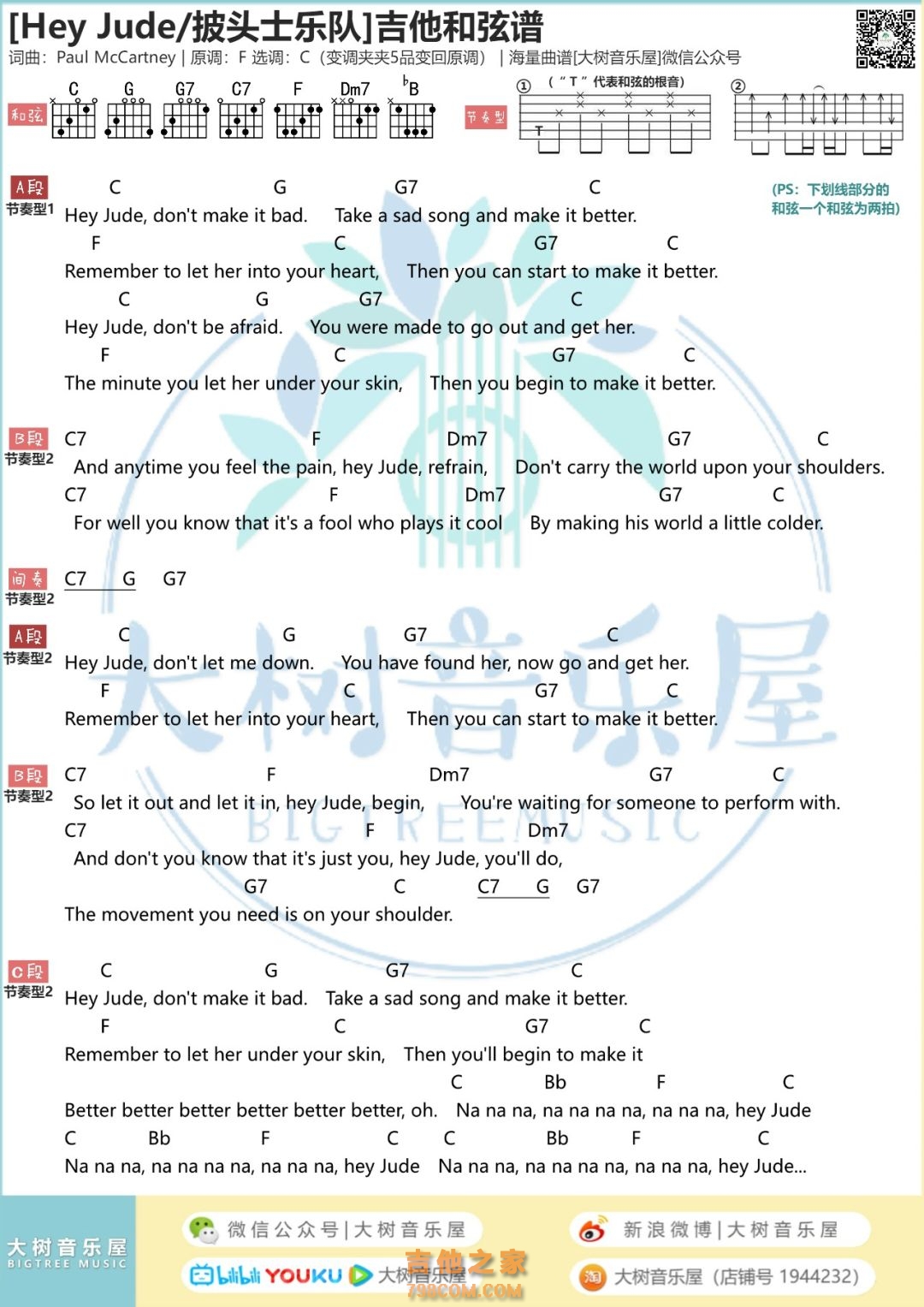 Hey Jude, don't make it bad. Take a sad song and make it better. Remember to let her into your heart, Then you can start to make it better. Hey Jude, don't be afraid. You were made to go out and get her. The minute you let her under your skin, Then you begin to make it better. And anytime you feel the pain, hey Jude, refrain, Don't carry the world upon your shoulders. For well you know that it's a fool who plays it cool By making his world a little colder. Hey Jude, don't let me down. You have found her, now go and get her. Remember to let her into your heart, Then you can start to make it better. So let it out and let it in, hey Jude, begin, You're waiting for someone to perform with. And don't you know that it's just you, hey Jude, you'll do, The movement you need is on the shoulder Hey Jude, don't make it bad. Take a sad song and make it better. Remember to let her under your skin, Then you'll begin to make it Better better better better better better, oh. Na na na, na na na na, na na na, hey Jude Na na na, na na na na, na na na, hey Jude Na na na, na na na na, na na na, hey Jude... 吉他和弦谱 |