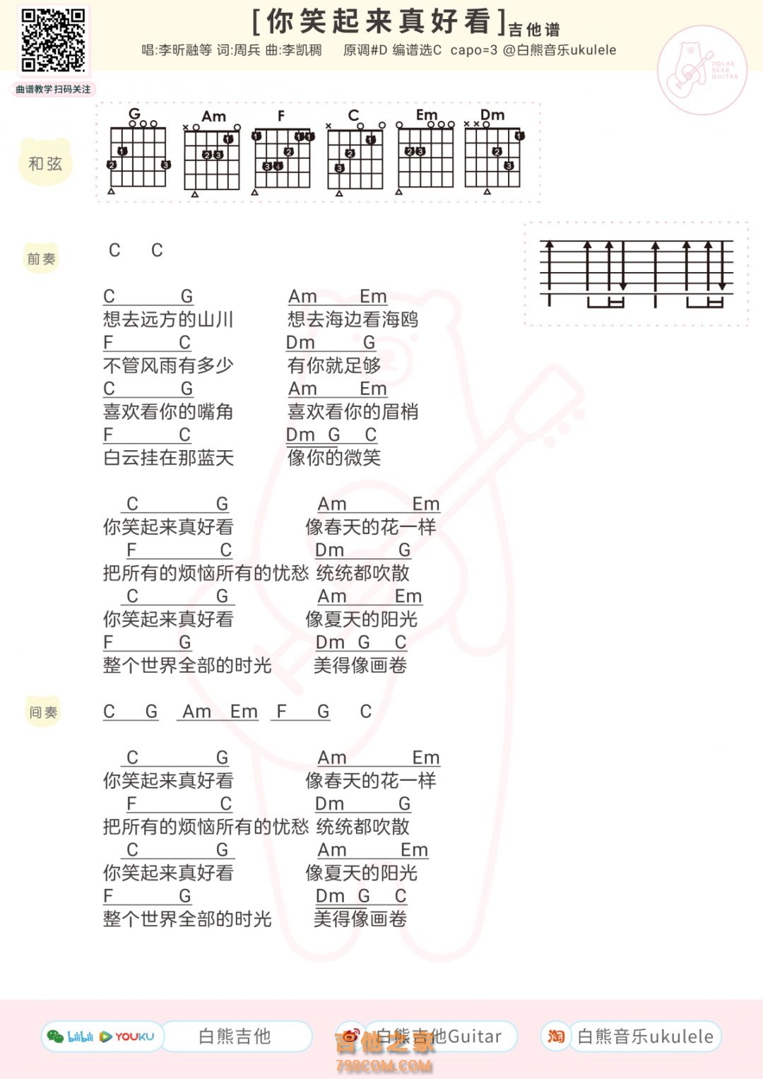 你笑起来真好看 想去远方的山川 想去海边看海鸥 不管风雨有多少 有你就足够 喜欢看你的嘴角 喜欢看你的眉梢 白云挂在那蓝天 像你的微笑 你笑起来真好看 像春天的花一样 把所有的烦恼所有的忧愁 统统都吹散 你笑起来真好看 像夏天的阳光 整个世界全部的时光 美得像画卷 〈你笑起来真好看〉是李昕融/樊桐舟/李凯稠2019年4月24日发行单曲。最惬意的事莫过于听一首如春风似暖阳的歌,纯真干净的童声涤荡着被都市蒙尘的心。 弹唱谱 弹奏难度 (较易) 1尤克里里谱 2吉他谱