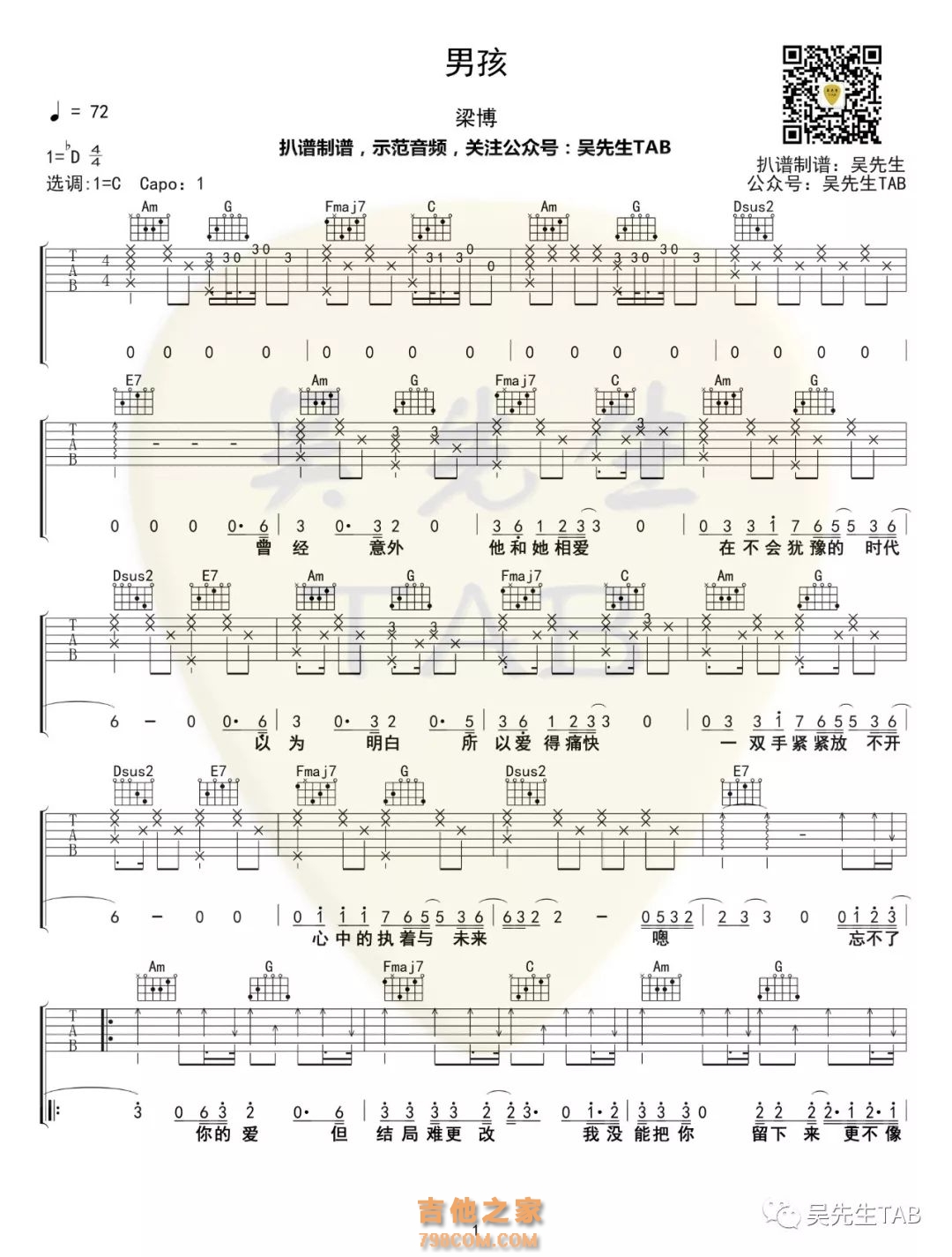 本章为“男孩吉他谱 梁博[吴先生TAB] ”信息,了解更多高清无码版本吉他谱、尤克里里、教学视频等信息,请关注吉他之家,我们会持续更新。