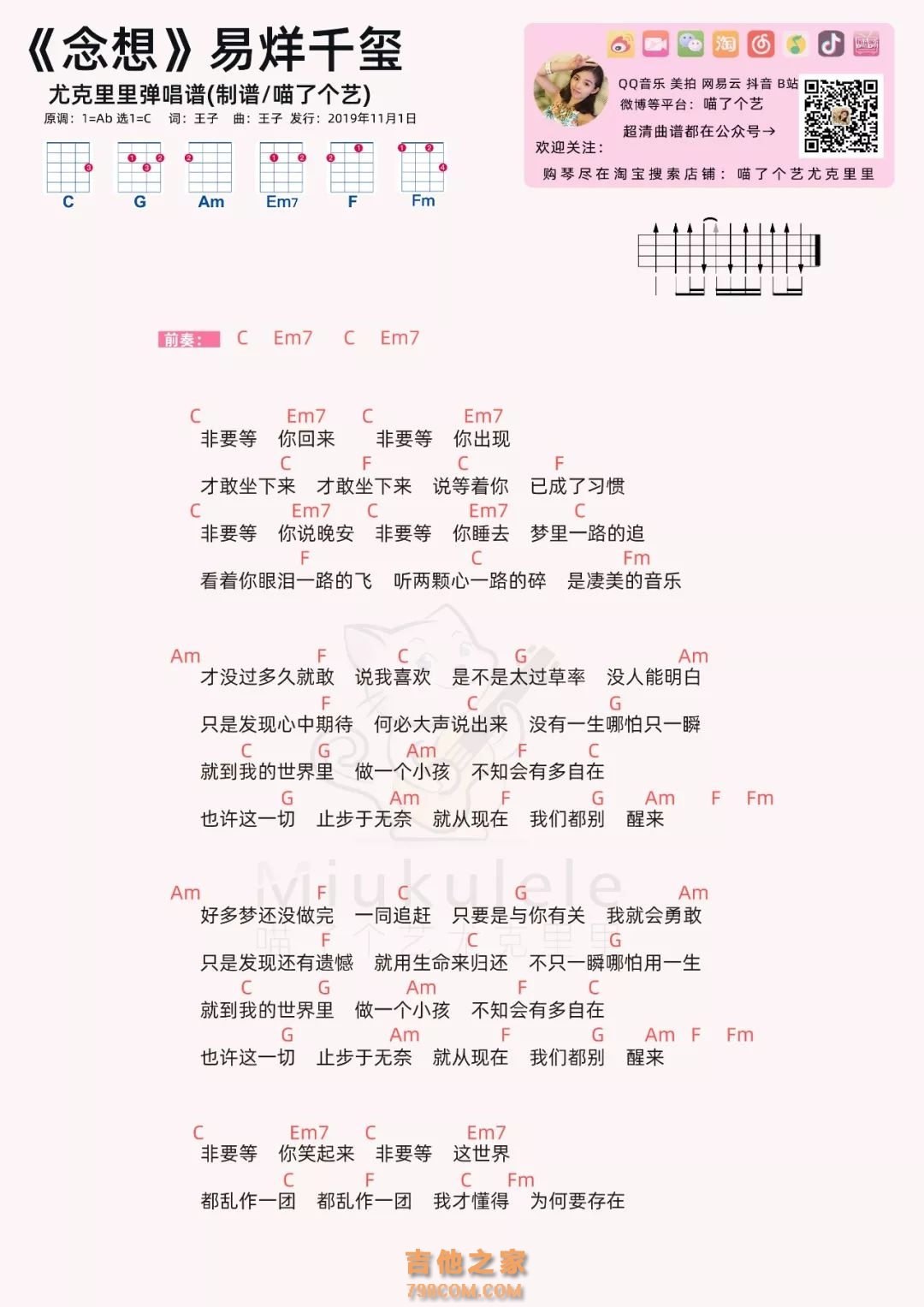 易烊千玺《念想》尤克里里谱 随着电影《少年的你》热映,昨天(11月1日)易烊千玺推出了一首歌曲,就是唱给电影当中两位少年,叫做《念想》,这首歌的歌词可以说是相当的虐心,让人分分钟联想到电影当中的情节,听众们不禁潸然泪下。 官方版MV