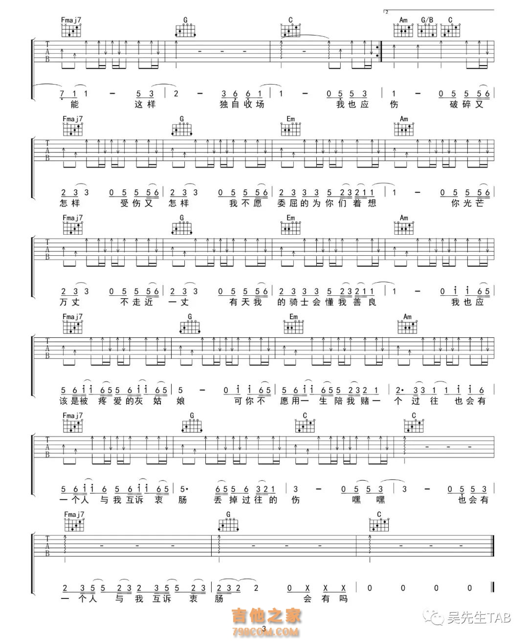 灰姑娘吉他谱C调 陈雪凝【 吴先生TAB】 陈雪凝最新单曲《灰姑娘》发行于2019年5月12日。 2018年,年仅16岁的陈雪凝就凭借单曲《假装》就获得了网易云音乐原创盛典年度十大歌曲奖。 2019年2月份,相继发行了《绿色》和《你的酒馆对我打了烊》两首单曲,可以说爆红网络。 《灰姑娘》这首歌的整体走向是:主歌1645+副歌4536451。 《绿色》的整体走向也是:主歌1645+副歌4536451。 《你的酒馆对我打了烊》的整体走向是:主歌4536456+副歌4536451 这三首是我扒过的,所以她大多数的歌都是主歌1645+副歌4536451的走向,以C调为例,那就是主歌C-Am-F-G +副歌F-G-Em-Am-F-G-C。所以说,其实这几首歌都可以串起来唱的,只是节奏快慢的问题,感兴趣的同学可以自己试一试。 跟陈雪凝差不多的还有今年爆红的隔壁老樊,《关于孤独我想说》《我曾》《世本常态》《妓和不如》《多想在平庸的生活拥抱你》等等凡是他自己写的歌基本上(当然也不是全部)副歌都是4536451的走向。 对于创作歌手来说创作太过于单一会很容易让人有审美疲劳,也许会有几首因为某种原因爆红的歌,但是如果不多尝试几种创作风格和创作类型,多数人也只是昙花一现罢了,是走不了多远的。 不知道4535451是什么意思的同学戳下面链接 神奇的45362(4)51