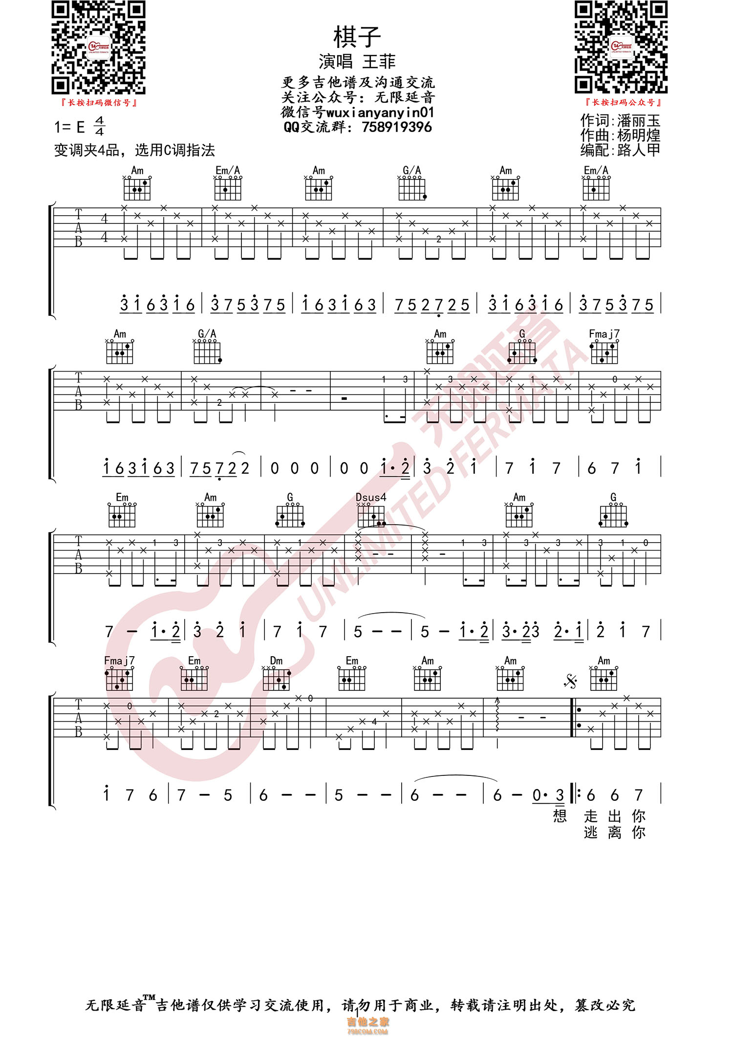 本章为“王菲 棋子 吉他谱 C调指法 无限延音编配 ”信息,了解更多高清无码版本吉他谱、尤克里里、教学视频等信息,请关注吉他之家,我们会持续更新。