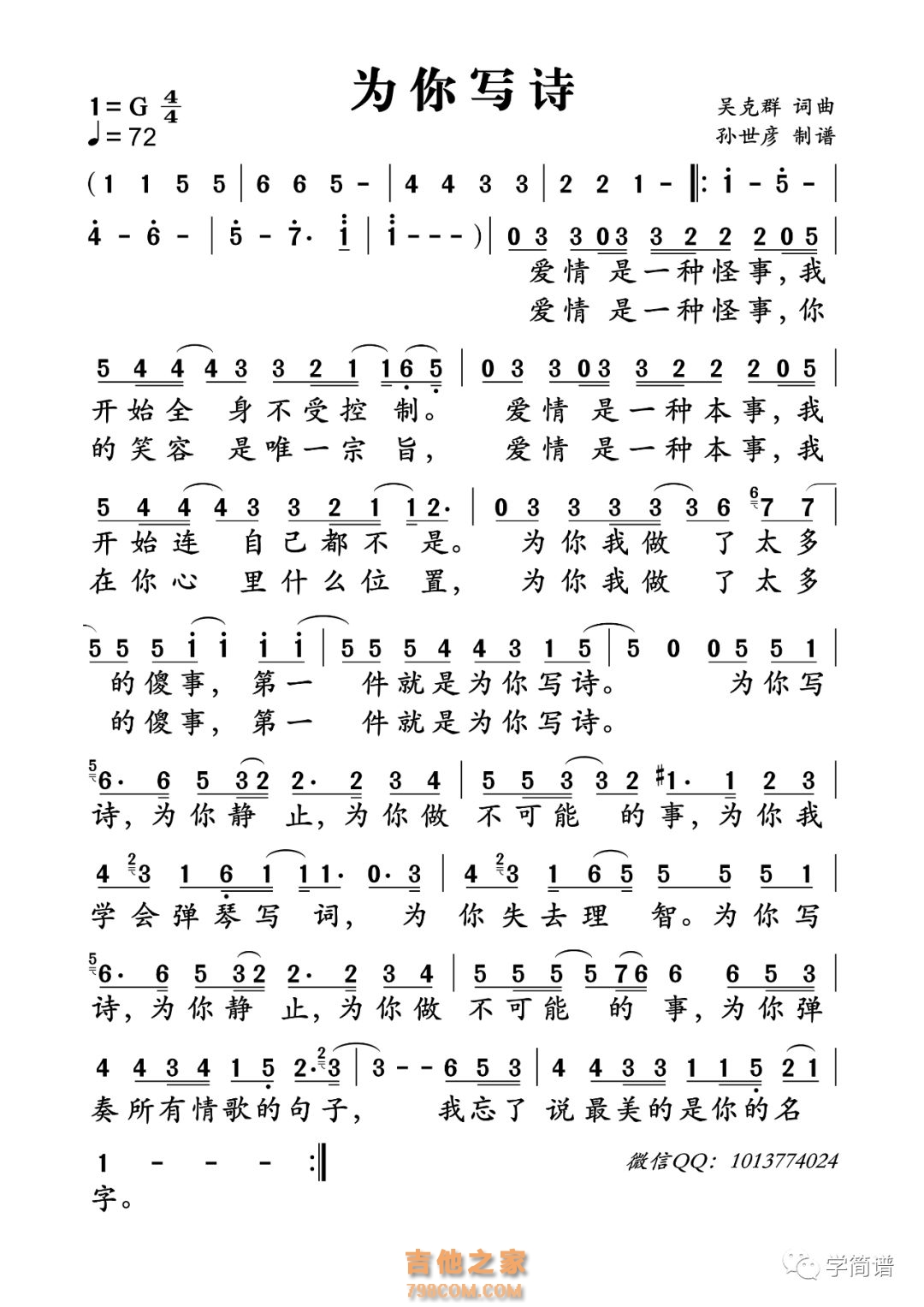 吉他之家为您提供:【为你写诗简谱】吴克群《为你写诗》简谱 ,查看更多【为你写诗简谱】吴克群《为你写诗》简谱 图片谱、C调吉他谱、D调吉他谱、E调吉他谱、F调吉他谱、G调吉他谱、A调吉他谱、B调吉他谱、TXT吉他谱版、GTP吉他谱版、【为你写诗简谱】吴克群《为你写诗》简谱 简谱、【为你写诗简谱】吴克群《为你写诗》简谱 尤克里里谱、六线谱、五线谱、吉他和弦谱及【为你写诗简谱】吴克群《为你写诗》简谱 吉他教学视频,请查看下方"相关阅读"。
